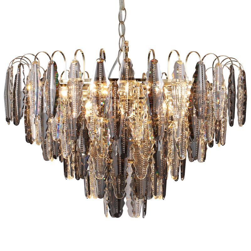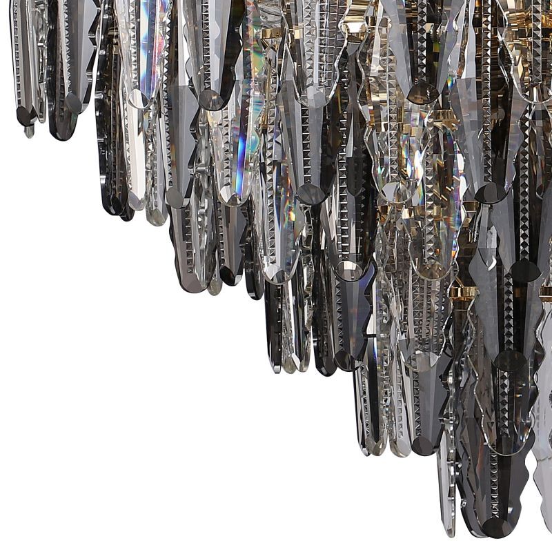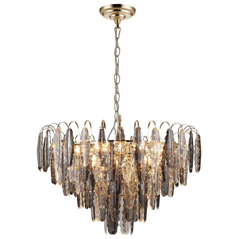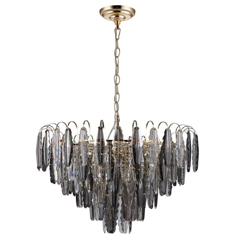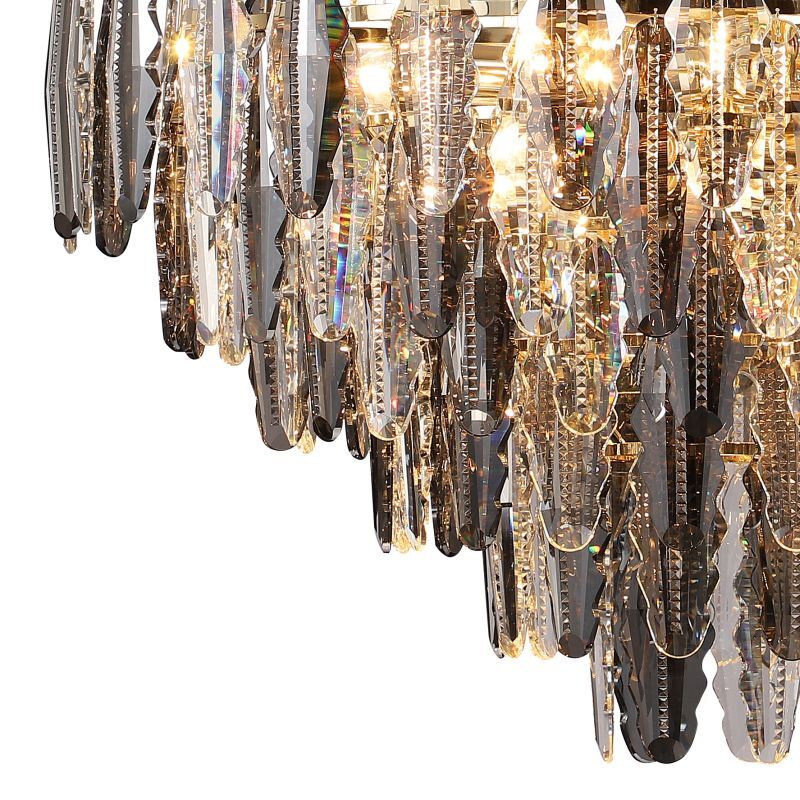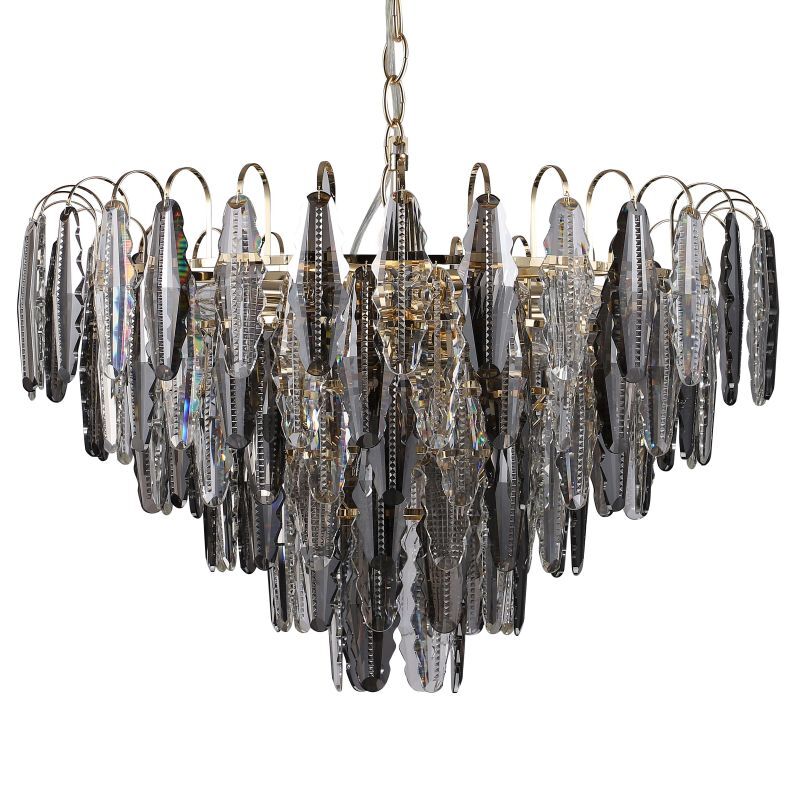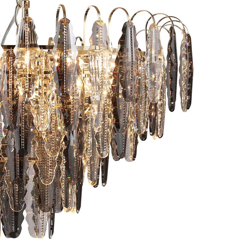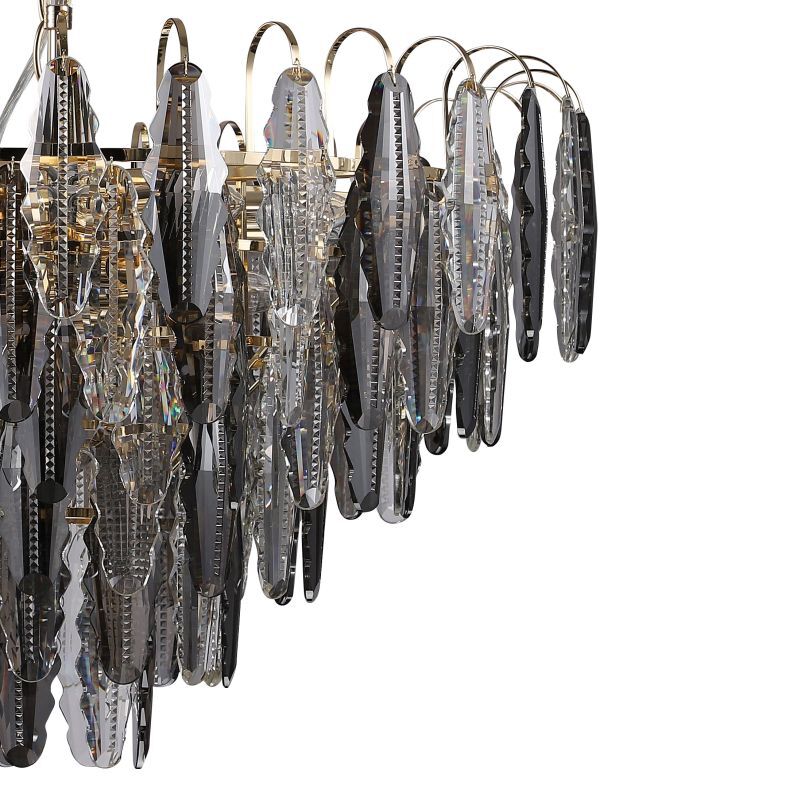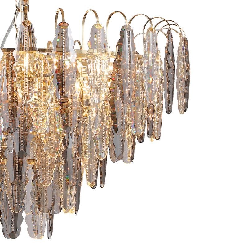 Люстра подвесная из коллекции Florin выполнена из металла, гальванизированного в цвет золота, и декорирована прозрачным и дымчатым хрусталем вытянутой формы высшей категории.