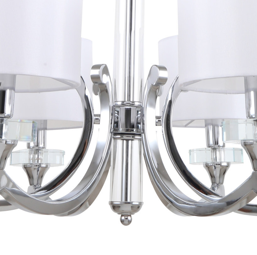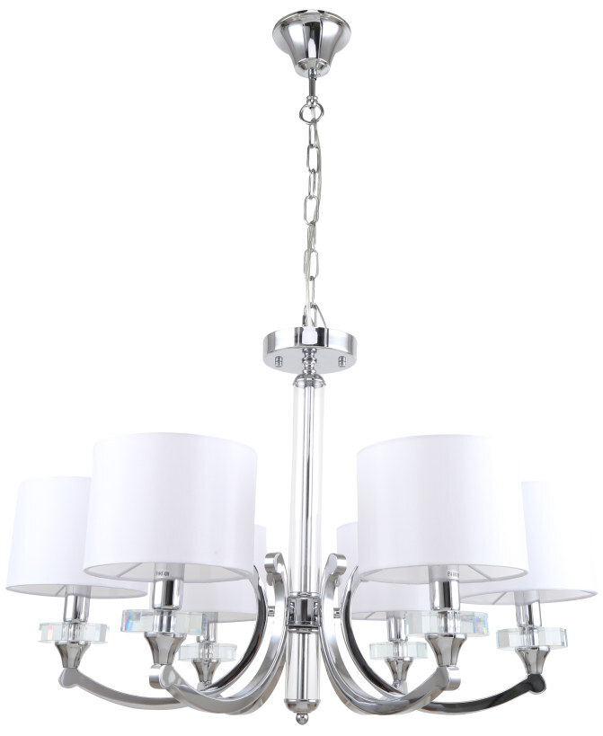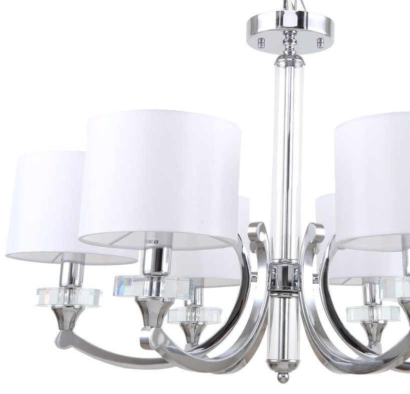 Люстра подвесная из коллекции Lordi выполнена из металла, гальванизированного в цвет хрома. Декоративные розетки выполнены из прозрачного стекла. Источники света закрыты белыми текстильными абажурами с термостойким акрилом внутри.