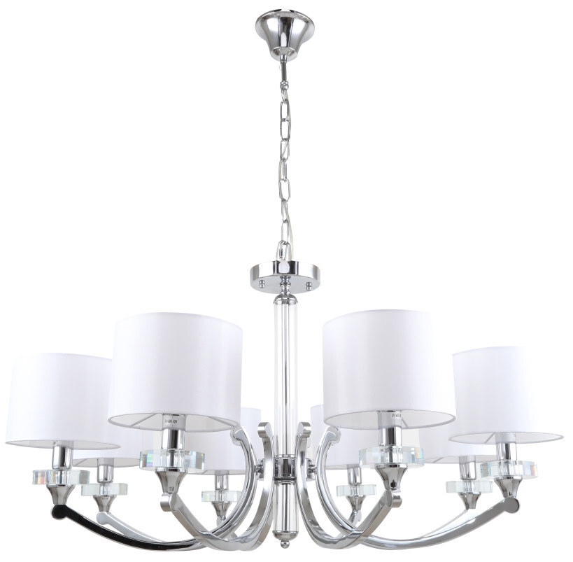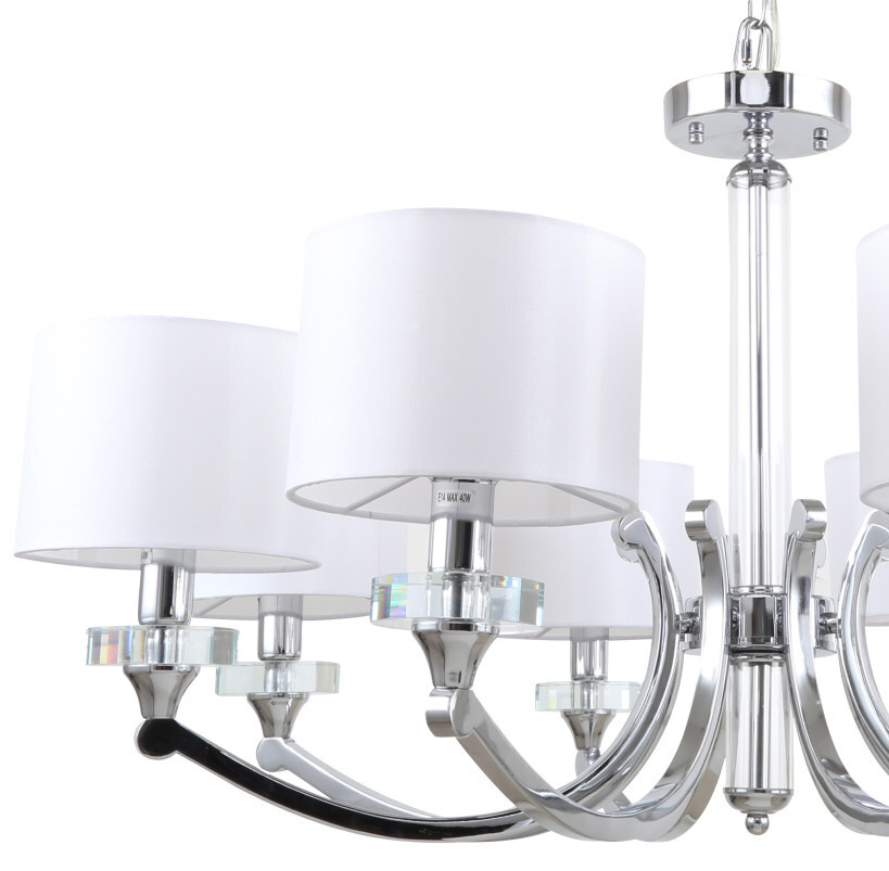 Люстра подвесная из коллекции Lordi выполнена из металла, гальванизированного в цвет хрома. Декоративные розетки выполнены из прозрачного стекла. Источники света закрыты белыми текстильными абажурами с термостойким акрилом внутри.