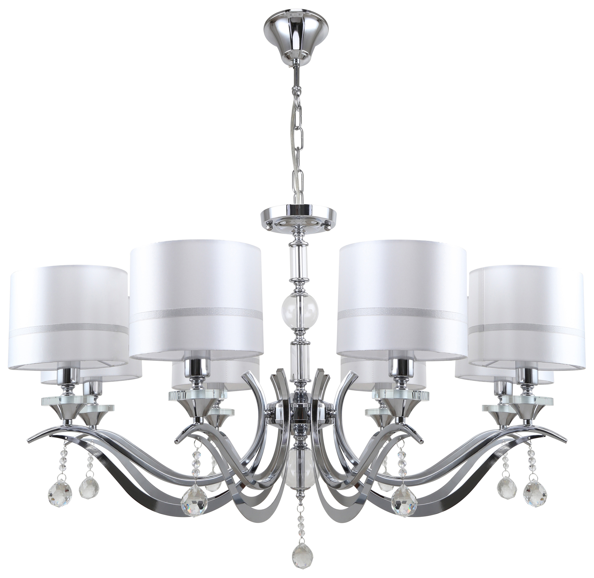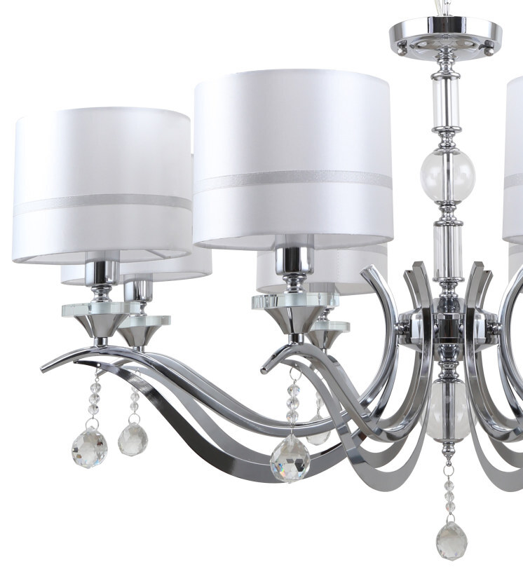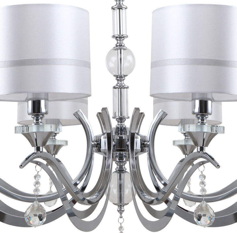 Люстра подвесная из коллекции Flippe выполнена из металла, гальванизированного в цвет хрома. Люстра декорирована прозрачным хрусталем в форме шара и декоративными розетками из прозрачного стекла. Источники света закрыты белыми текстильными абажурами с термостойким акрилом внутри. Абажуры отделаны серым кантом.