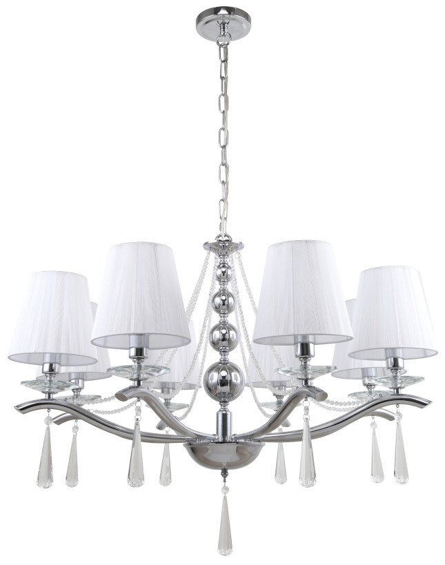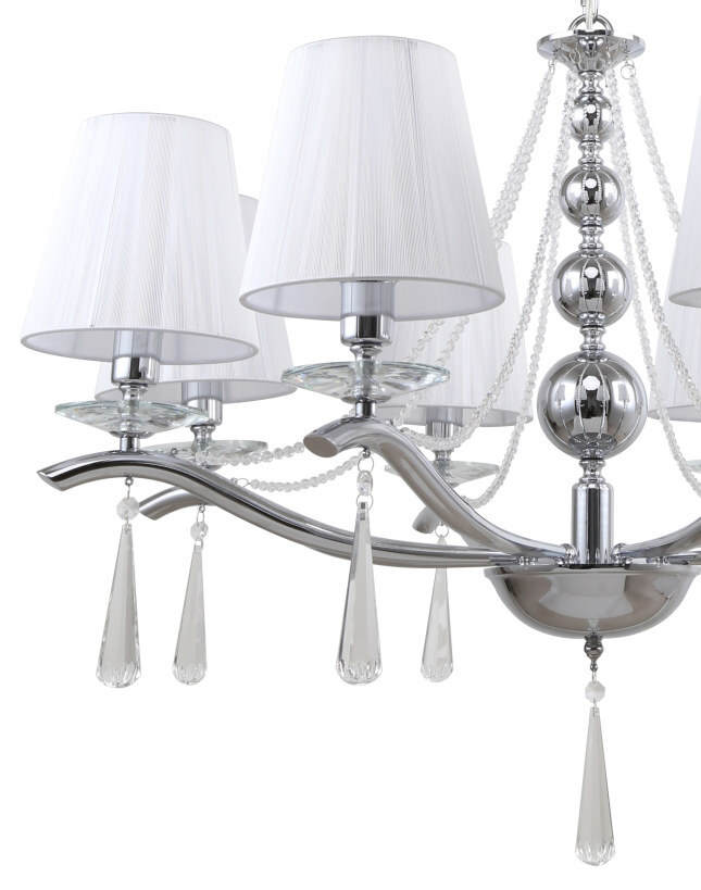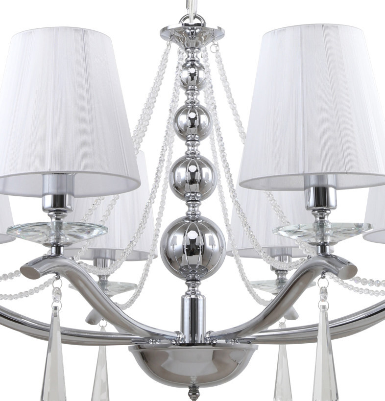 Люстра подвесная из коллекции Nifty выполнена из металла, гальванизированного в цвет хрома. Текстильные абажуры белого цвета создают мягкий рассеянный свет. Люстра коллекции декорирована прозрачными хрустальными бусами и подвесками каплевидной формы, а также декоративными розетками из массива хрусталя.