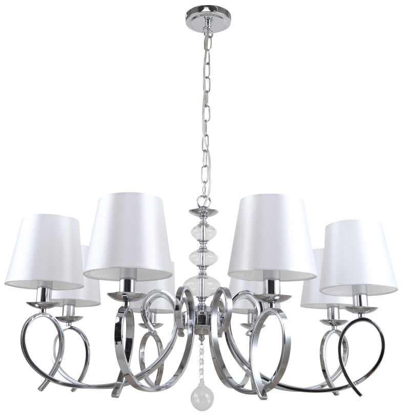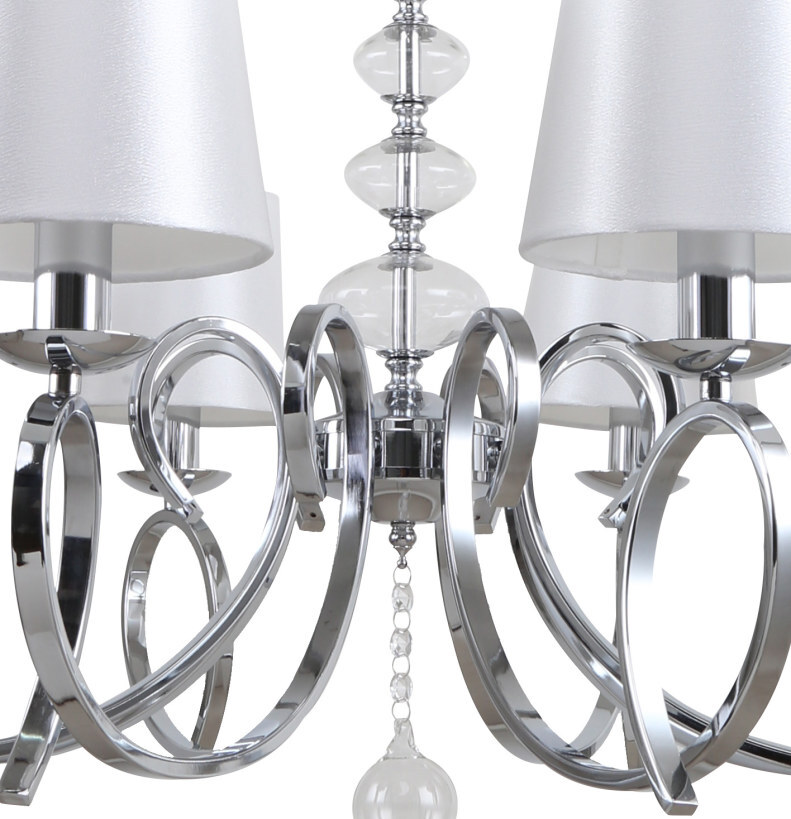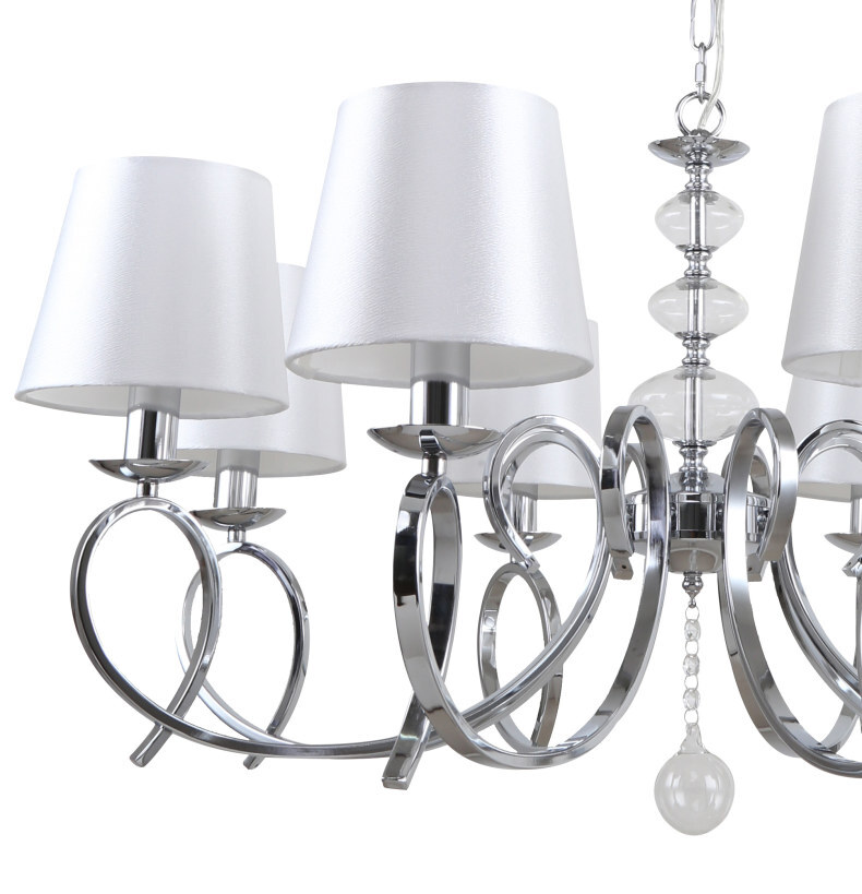 Люстра подвесная из коллекции Zafira выполнена из металла, гальванизированного в цвет хрома, и декорирована текстильными атласными абажурами белого цвета с термостойким акрилом внутри.