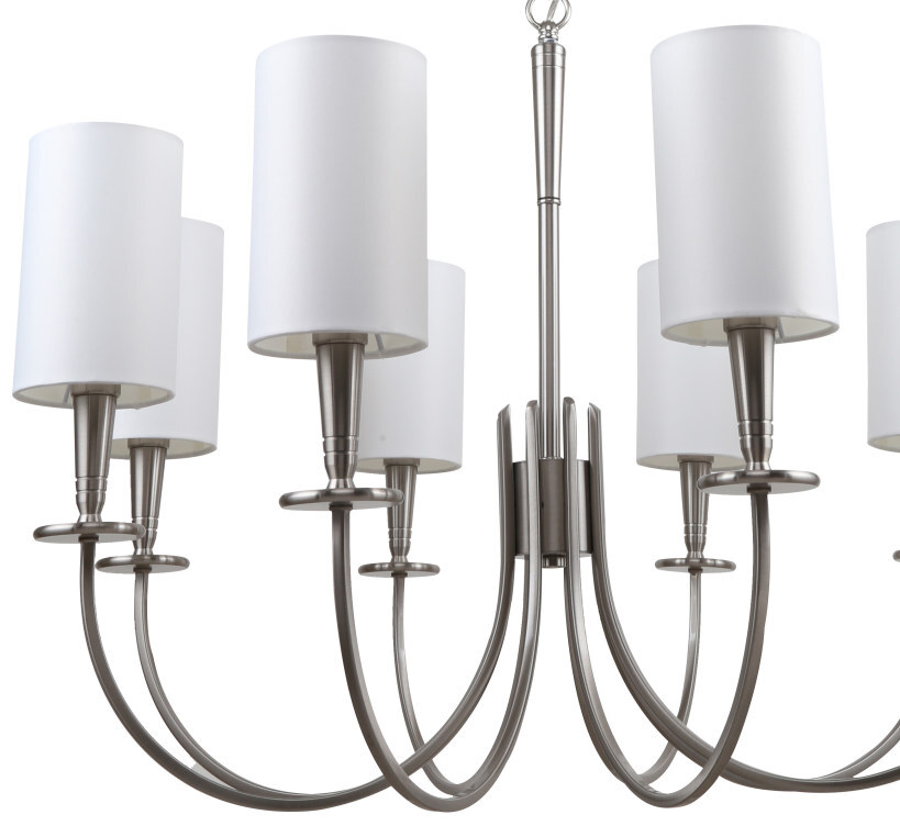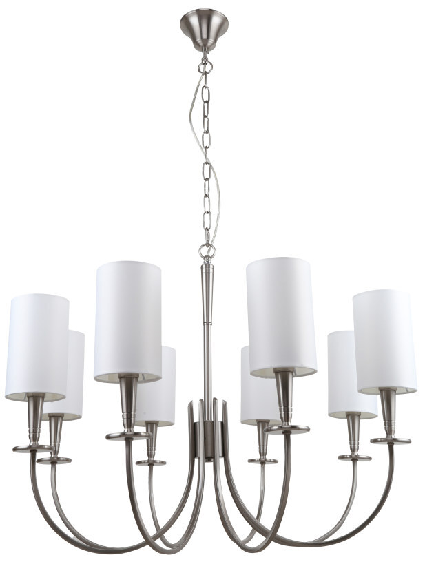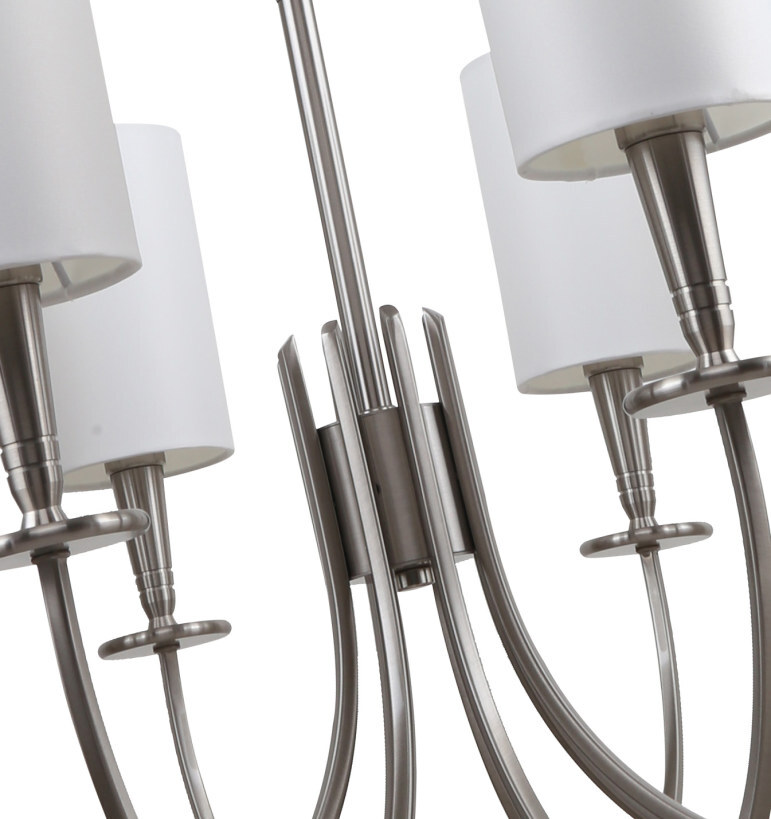 Люстра подвесная из коллекции Flokky выполнена из металла, гальванизированного в цвет никеля, и декорирована вытянутыми текстильными абажурами белого цвета с термостойким акрилом внутри.