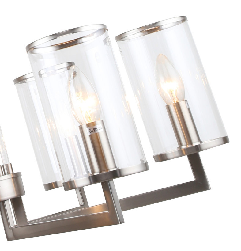 Люстра подвесная из коллекции Vase выполнена из металла, гальванизированного в цвет никеля, и декорирована стеклянными стержнями и вытянутыми прозрачными стеклянными плафонами. Плафоны отделаны металлическим кантом, гальванизированным в цвет арматуры.