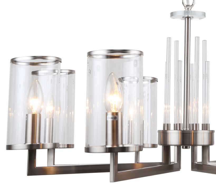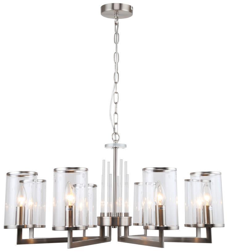 Люстра подвесная из коллекции Vase выполнена из металла, гальванизированного в цвет никеля, и декорирована стеклянными стержнями и вытянутыми прозрачными стеклянными плафонами. Плафоны отделаны металлическим кантом, гальванизированным в цвет арматуры.