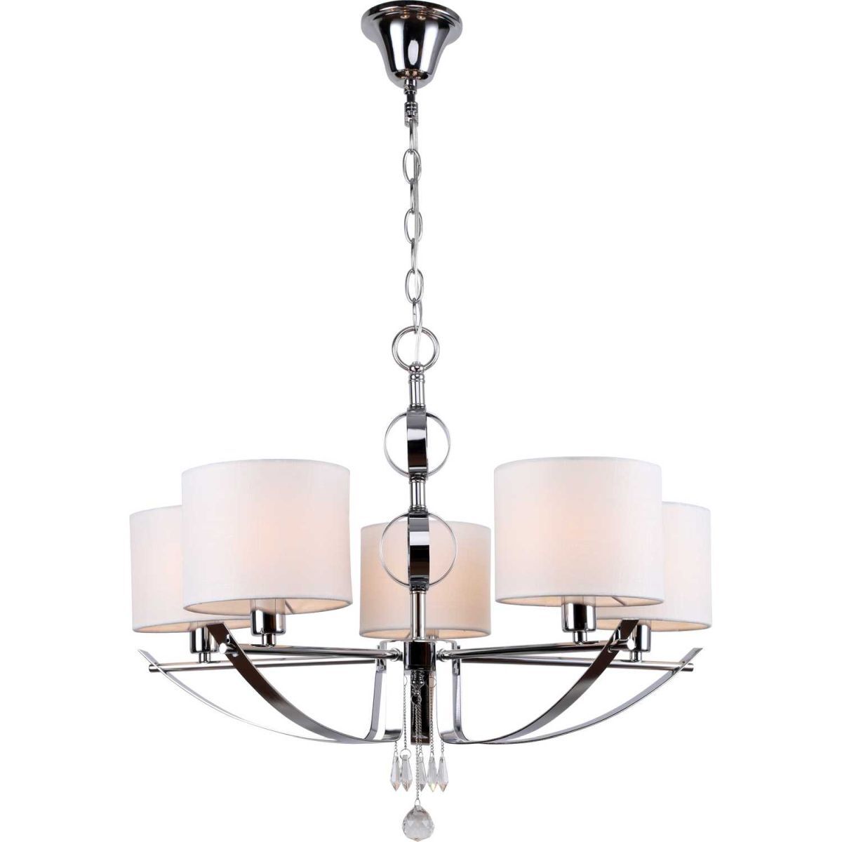 Люстра подвесная из коллекции Dora выполнена из металла, гальванизированного в цвет хрома, и декорирована цилиндрическими текстильными абажурами белого цвета с термостойким акрилом внутри и хрустальными подвесками каплевидной формы и формы шара.