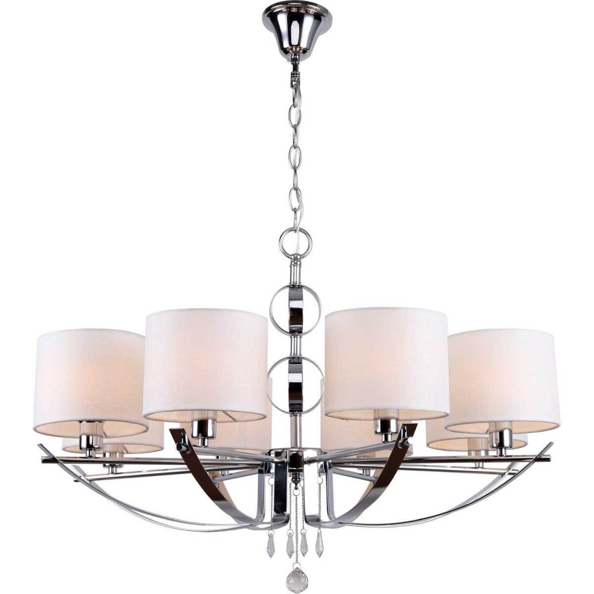 Люстра подвесная из коллекции Dora выполнена из металла, гальванизированного в цвет хрома, и декорирована цилиндрическими текстильными абажурами белого цвета с термостойким акрилом внутри и хрустальными подвесками каплевидной формы и формы шара.