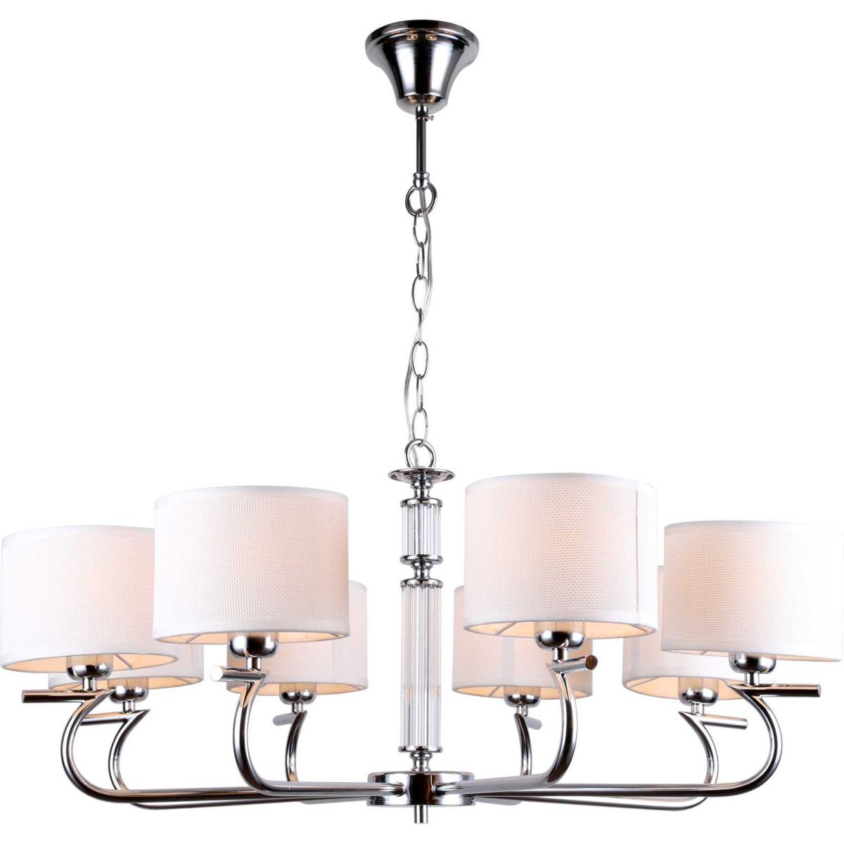 Люстра подвесная из коллекции Ellada выполнена из металла, гальванизированного в цвет хрома, и декорирована текстильными цилиндрическими абажурами кремового цвета с термостойким акрилом внутри и прозрачным стеклом линейной структуры на центральной оси.