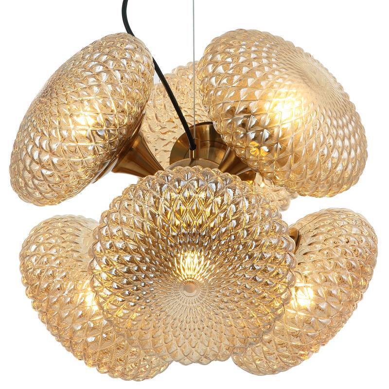 Люстра подвесная из коллекции Roxie выполнена из металла, гальванизированного в цвет бронзы, и декорирована плафоном овальной формы из фактурного градуированного стекла янтарного цвета. Премиальное качество и неповторимыи? дизаи?н светильников идеально подои?дут в современные и дизайнерские интерьеры.
