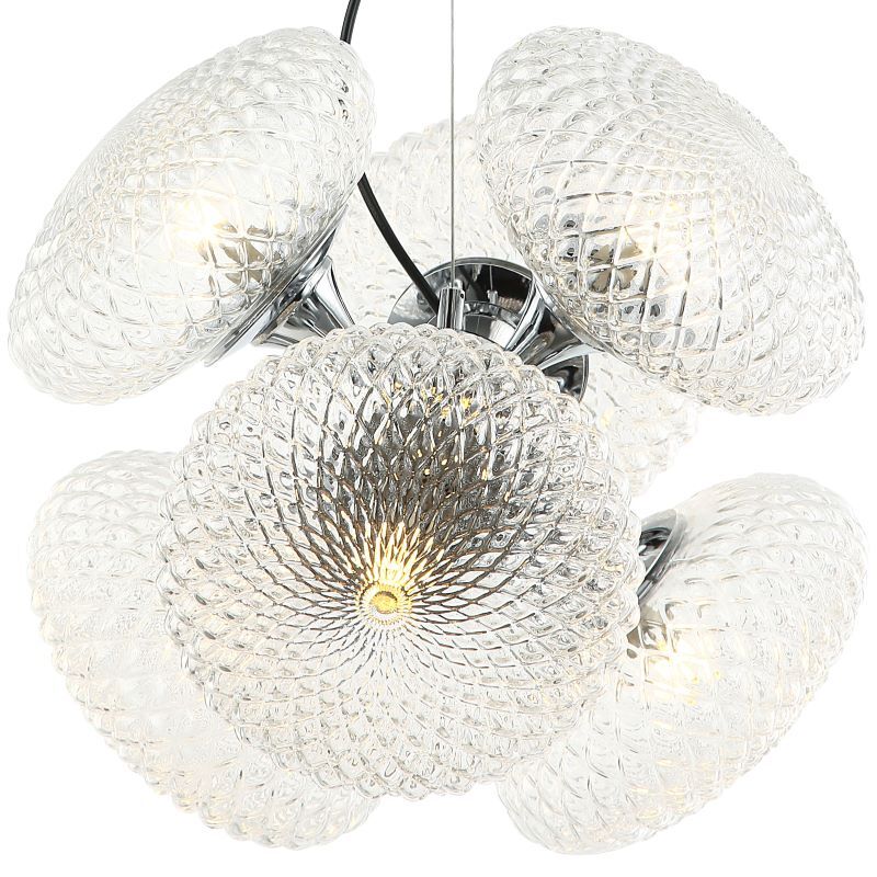 Люстра подвесная из коллекции Roxie выполнена из металла, гальванизированного в цвет хрома, и декорирована плафонами овальной формы из прозрачного фактурного градуированного стекла. Премиальное качество и неповторимыи? дизаи?н светильников идеально подои?дут в современные и дизайнерские интерьеры.