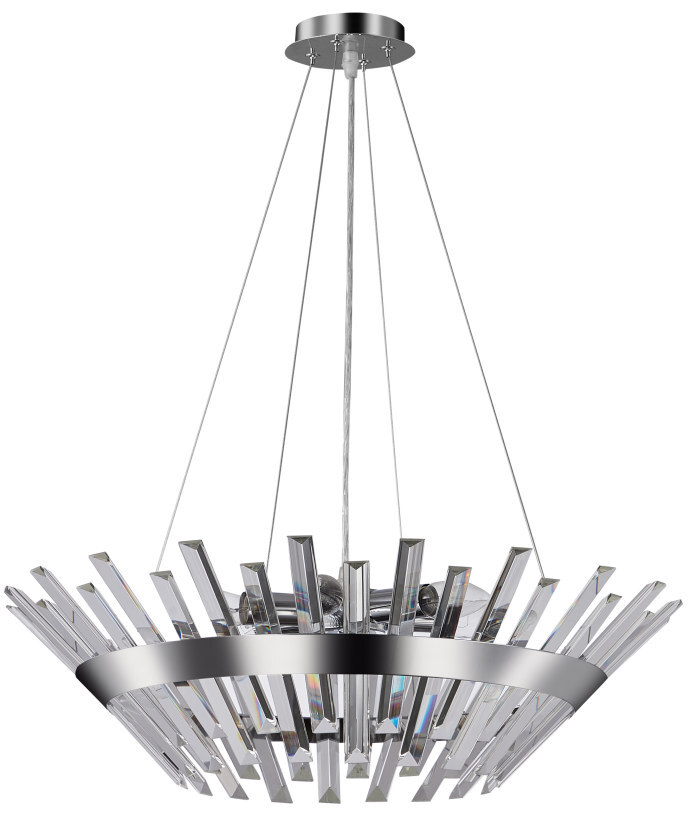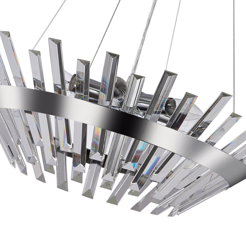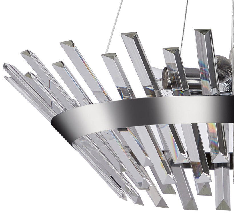 Люстра подвесная из коллекции Snowy выполнена из металла, гальванизированного в цвет хрома, и декорирована прозрачным хрусталем высшей категории прямоугольной формы разных размеров. Уникальный дизайн придает светильнику элегантность.