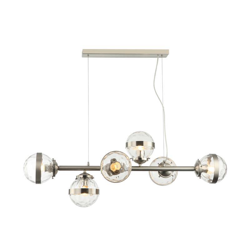 Люстра подвесная вытянутой формы из коллекции Sogno выполнена из металла, гальванизированного в цвет никеля, и декорирована плафонами из прозрачного стекла, имитирующего вулканическое стекло. По центру плафоны отделаны металлическим кантом, гальванизированным в цвет арматуры. Люстра выглядит стильно и респектабельно. Премиальное качество и неповторимыи? дизаи?н светильников идеально подои?дут в современные и дизайнерские интерьеры.