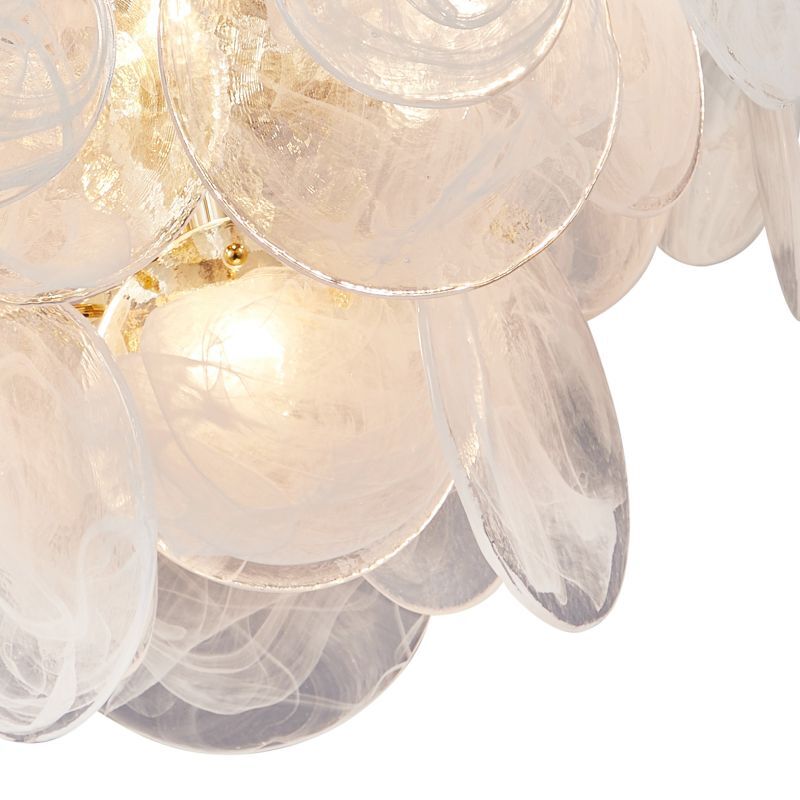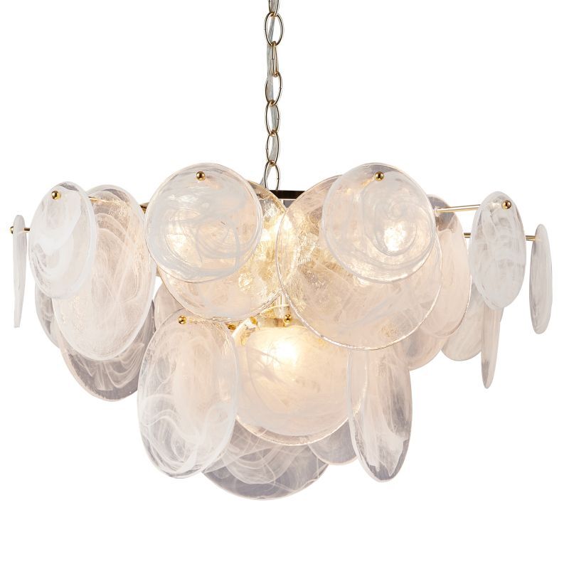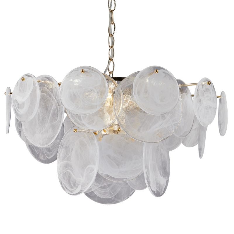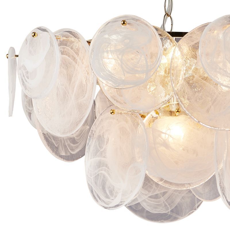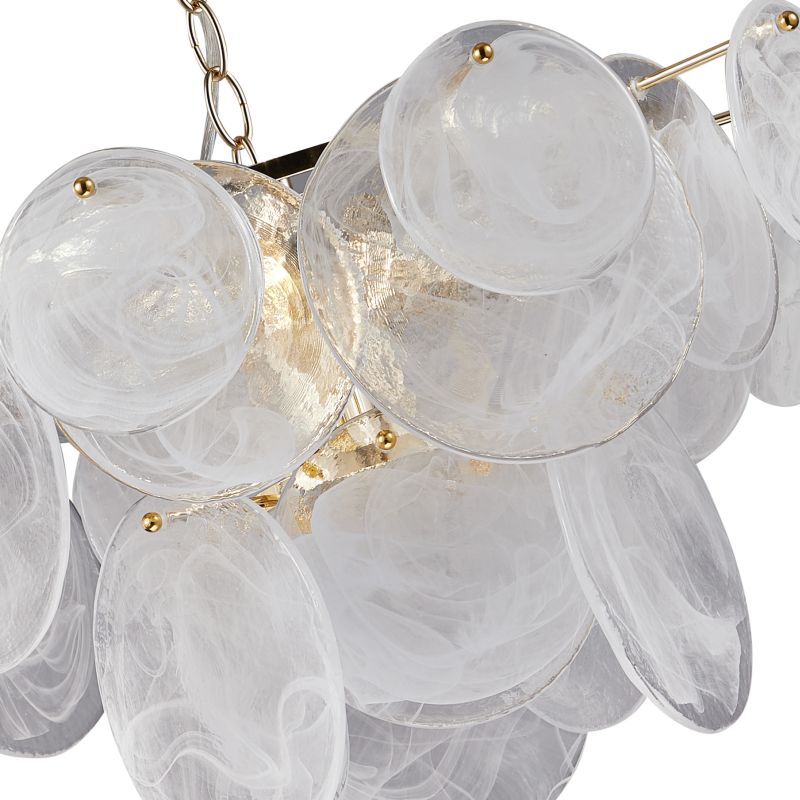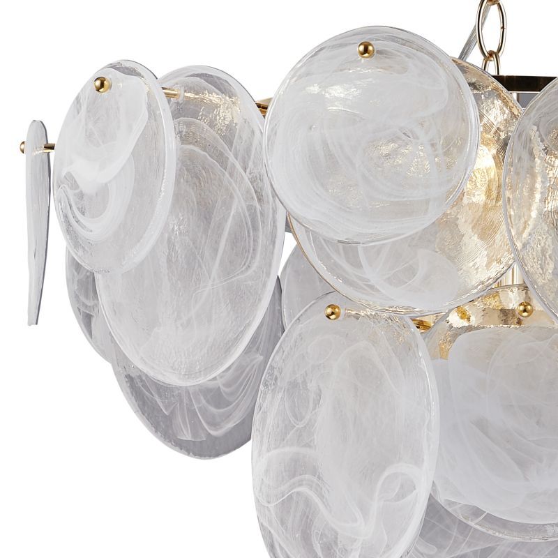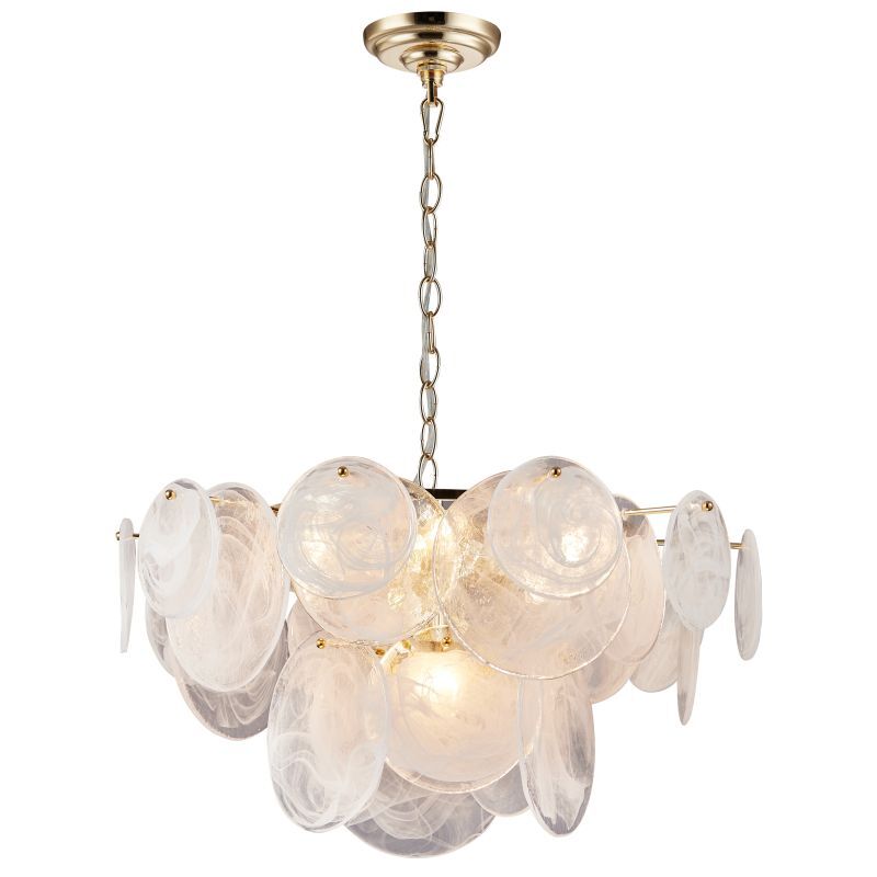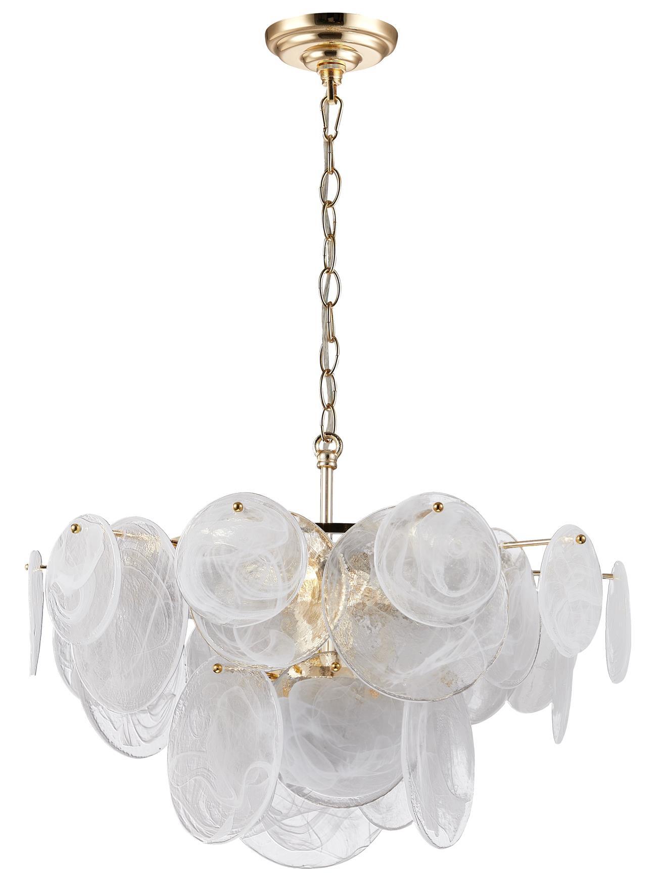Люстра подвесная из коллекции Elegantly выполнена из металла, гальванизированного в цвет золота, и декорирована круглыми пластинами из алебастрового стекла разного размера.Премиальное качество и неповторимыи? дизаи?н светильников идеально подои?дут в современные и дизайнерские интерьеры.