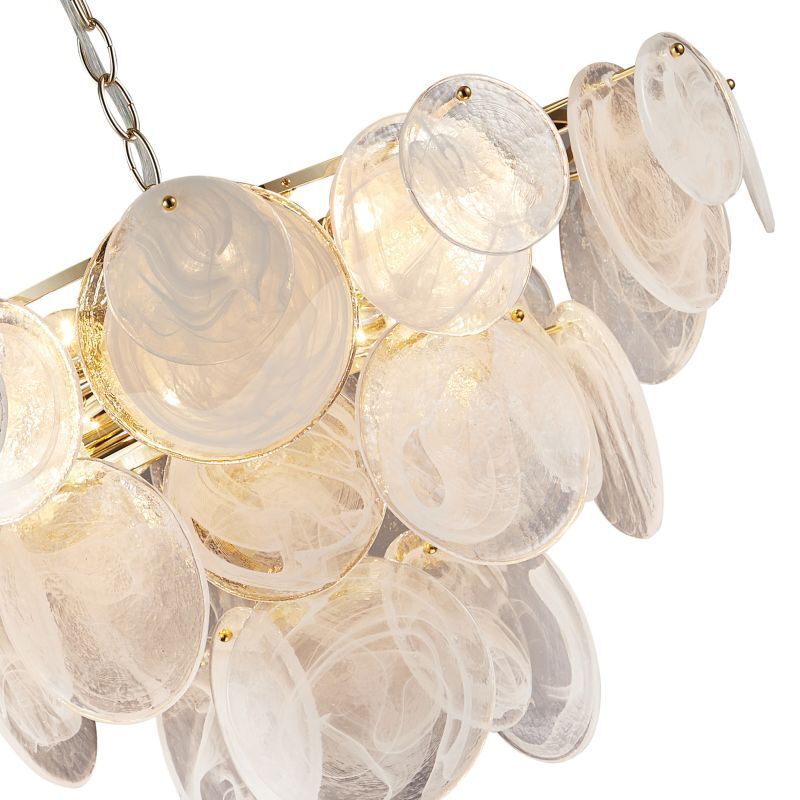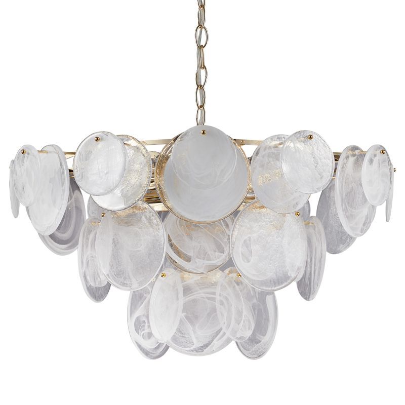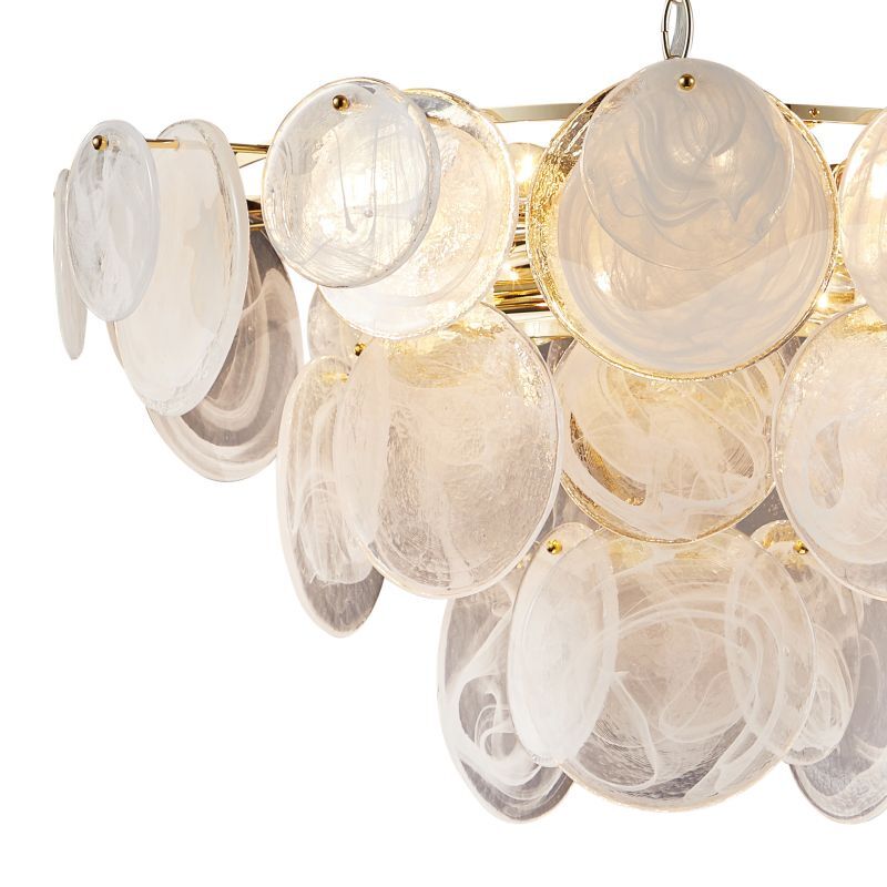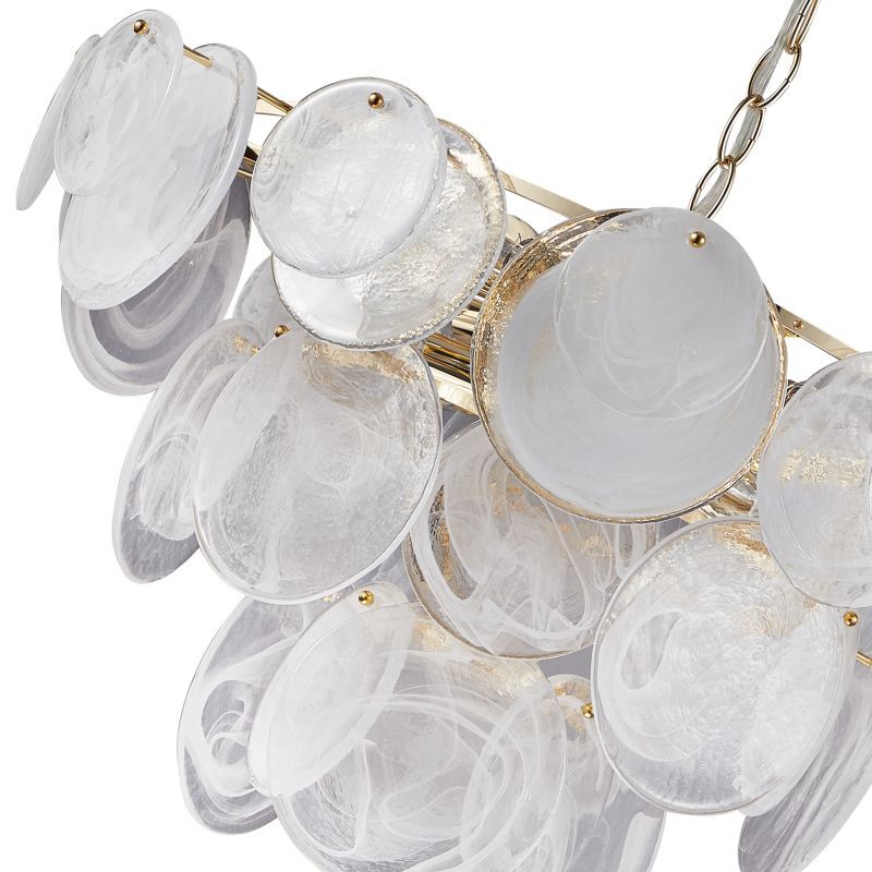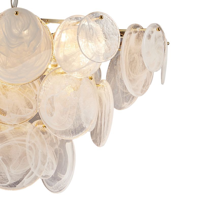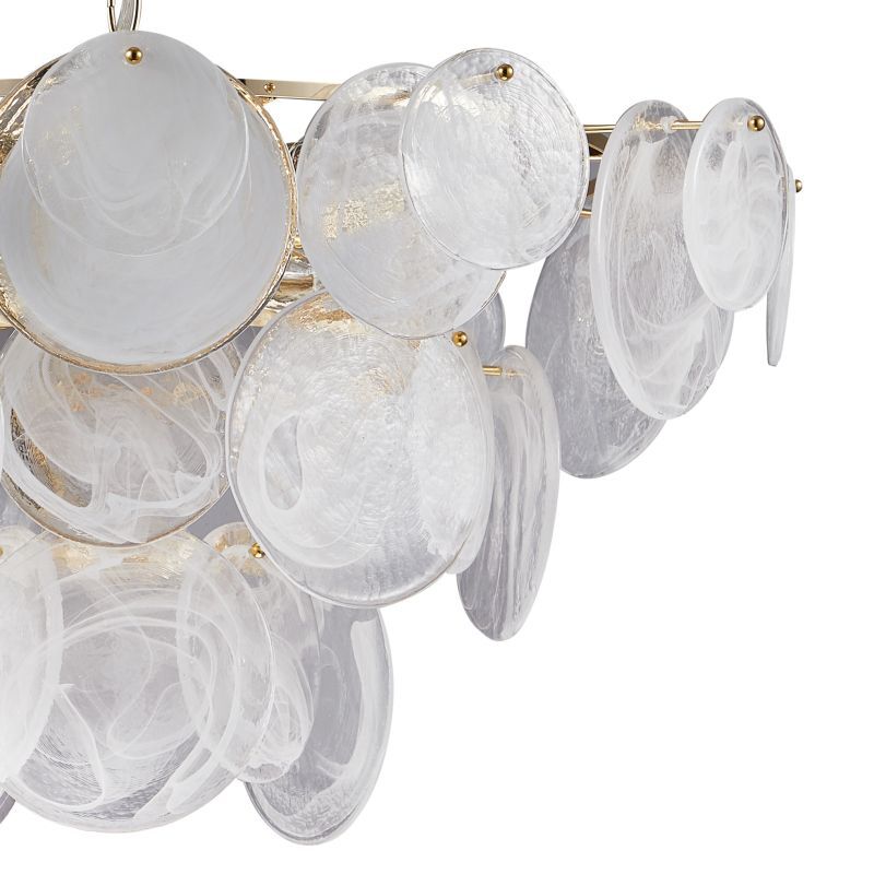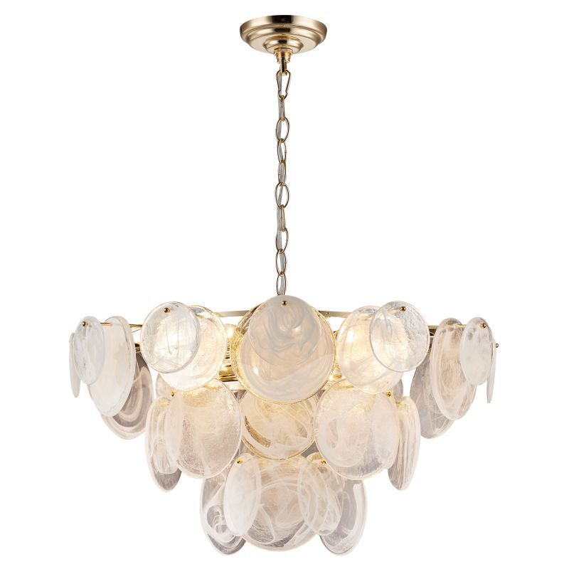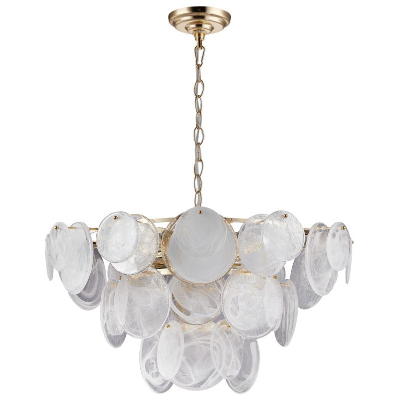 Люстра подвесная из коллекции Elegantly выполнена из металла, гальванизированного в цвет золота, и декорирована круглыми пластинами из алебастрового стекла разного размера. Премиальное качество и неповторимыи? дизаи?н светильников идеально подои?дут в современные и дизайнерские интерьеры.