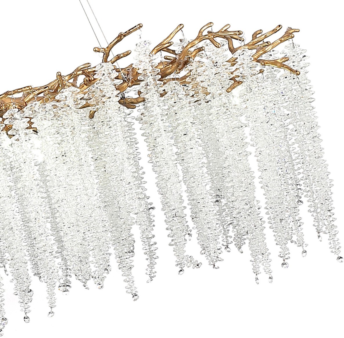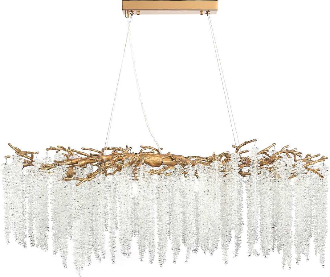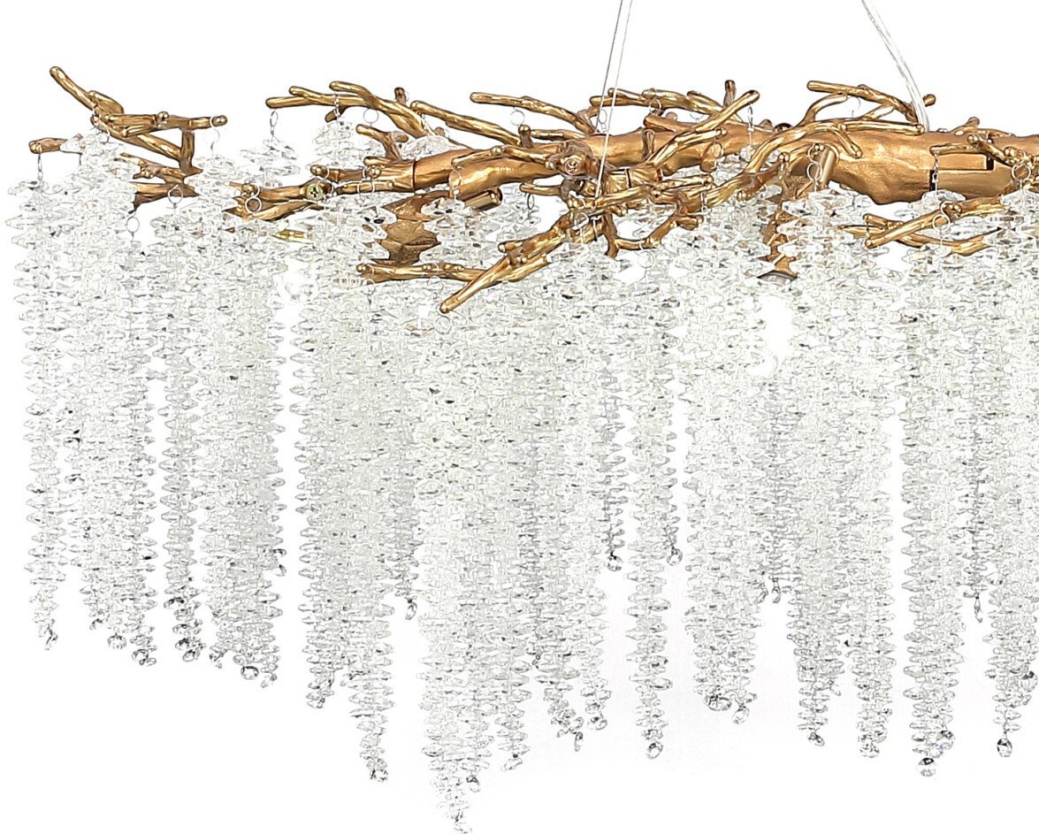 Люстра подвесная вытянутой формы коллекции EIVA выполнена из сплава алюминия, гальванизирована в цвет бронзы и декорирована гроздьями из хрусталя в форме октагон. Светильники отличает увеличенное количество хрусталя (120 хрустальных гроздьев), фактурная чеканка на потолочной чаше и лампы с цоколем Е14. Из данной коллекции светильников можно сделать индивидуальный заказ любого цвета и размера.
