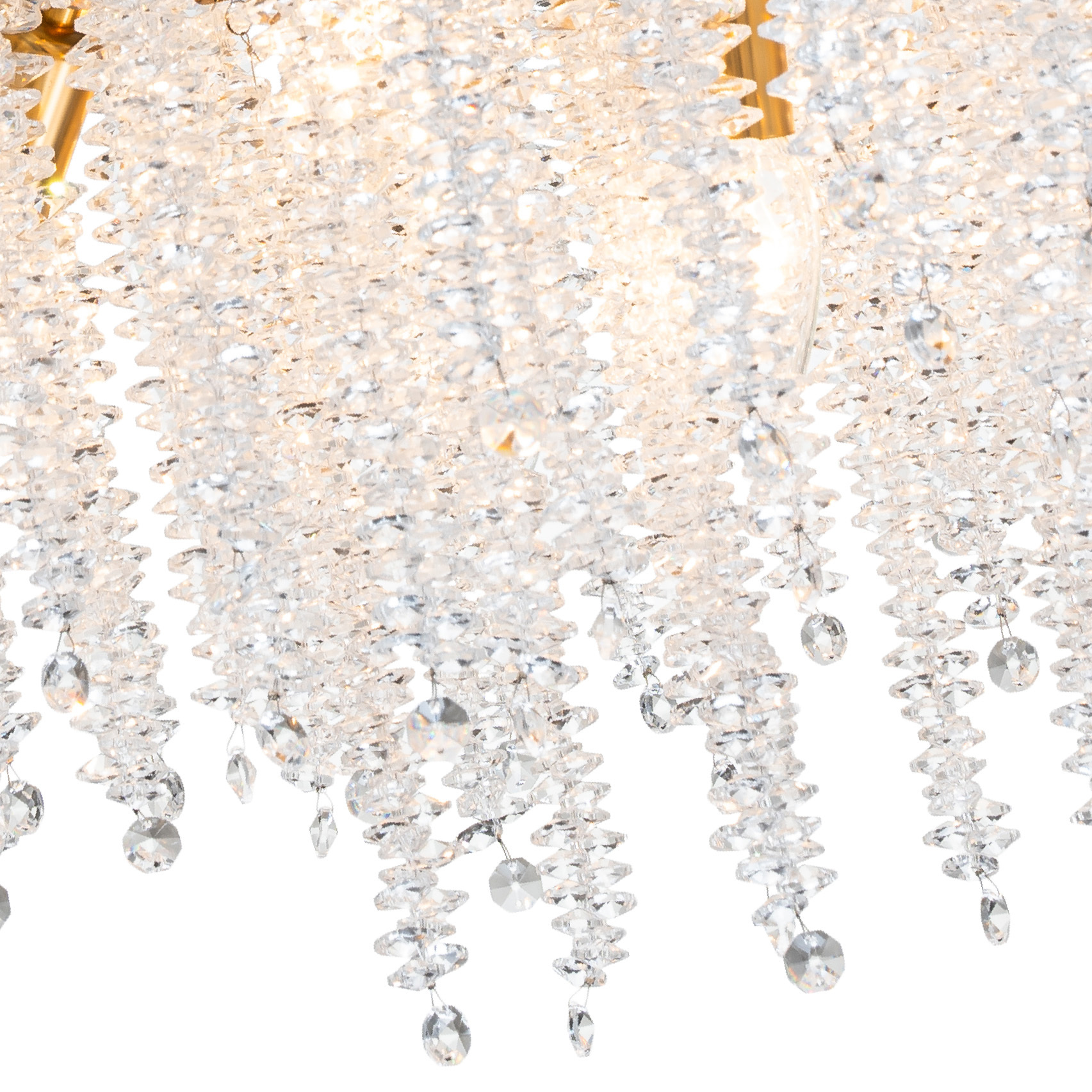 Люстра подвесная коллекции EIVA выполнена из сплава алюминия, гальванизирована в цвет бронзы и декорирована гроздьями из хрусталя в форме октагон. Светильники коллекции отличает увеличенное количество хрусталя (76 хрустальных гроздьев), фактурная чеканка на потолочной чаше и лампы с цоколем Е14. Из данной коллекции светильников можно сделать индивидуальный заказ любого цвета и размера.