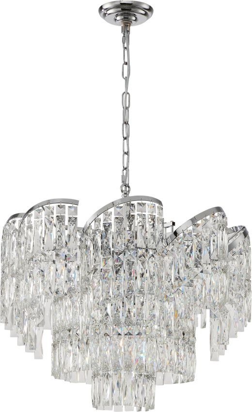 Люстра подвесная из коллекции Sapparo выполнена из металла, гальванизированного в цвет хрома, и декорирована хрусталем вытянутой формы высшей категории. Хрусталь многослойно располагается на изогнутых металлических элементах в виде спирали. Современная форма и высокое качество светильников идеально подойдут как в классические, так и современные интерьеры. Из данной коллекции светильников можно сделать индивидуальный заказ любого цвета и размера.