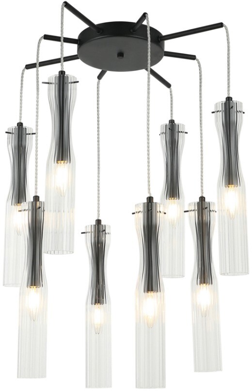 Люстра подвесная эксклюзивной коллекции MONNE выполнена из металла, окрашенного в черный цвет, и стеклянных плафонов линейной текстуры изогнутой формы. Светильник данной коллекции имеет возможность регулировки высоты для помещений как с низким, так и с высоким потолком. Премиальное качество и неповторимый дизайн светильника идеально подойдут в классические и современные интерьеры.