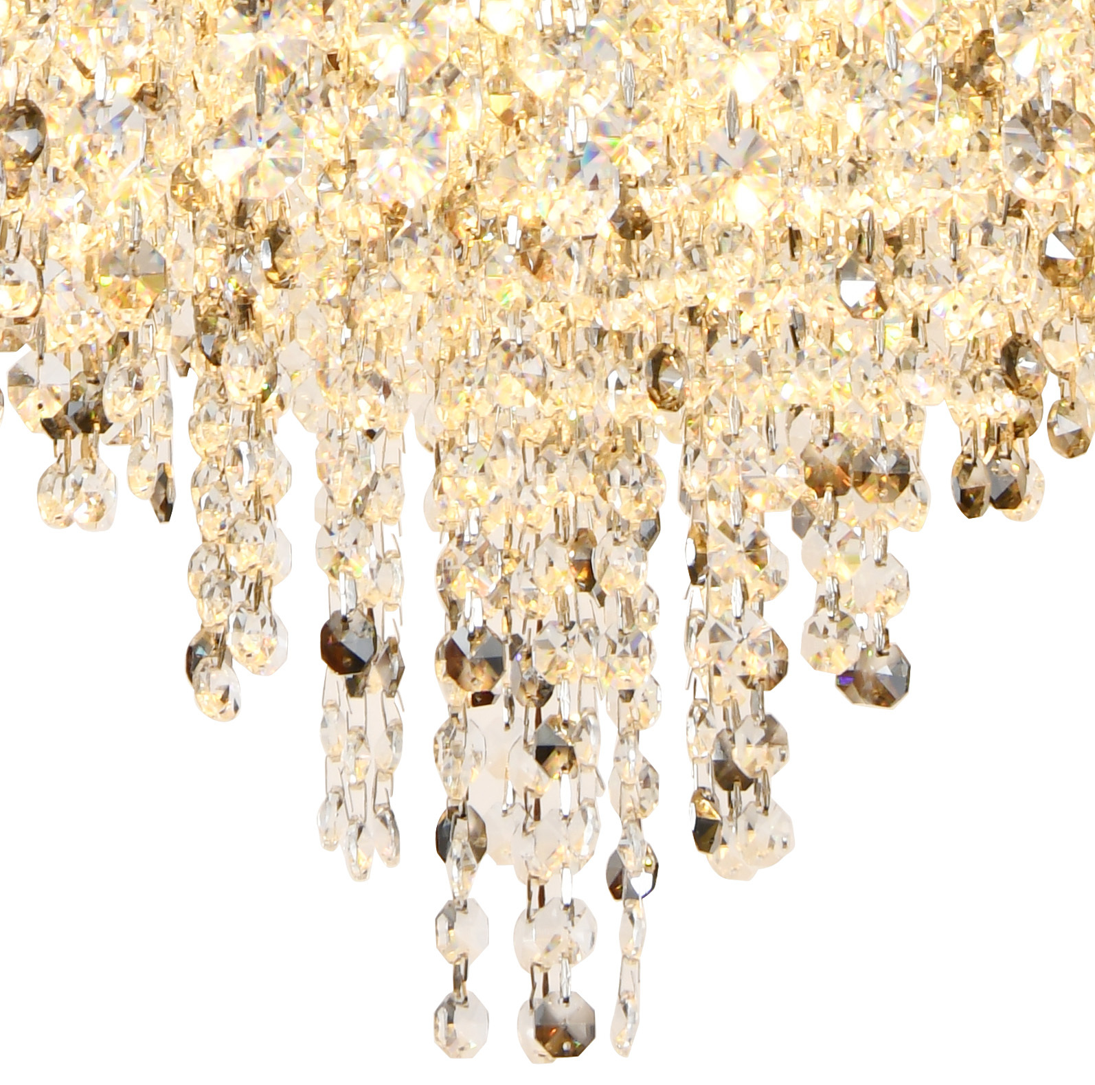 Люстра подвесная коллекции Rain of Crystal выполнена из металла, гальванизированного в цвет хрома, и декорирована прозрачным и дымчатым хрусталём высшей категории. Особенностью данной коллекции является возможность использовать её как в подвесном, так и в потолочном варианте. На верхней части люстры установлен декоративный лист из нержавеющей стали, отполированный до зеркального блеска, который скрывает технические элементы и позволяет устанавливать её в лестничных проёмах и помещениях со вторым светом. Высокое качество и неповторимый дизайн светильника идеально подойдут как для классических, так и для современных интерьеров. Из данной коллекции светильников можно сделать индивидуальный заказ любого цвета и размера.