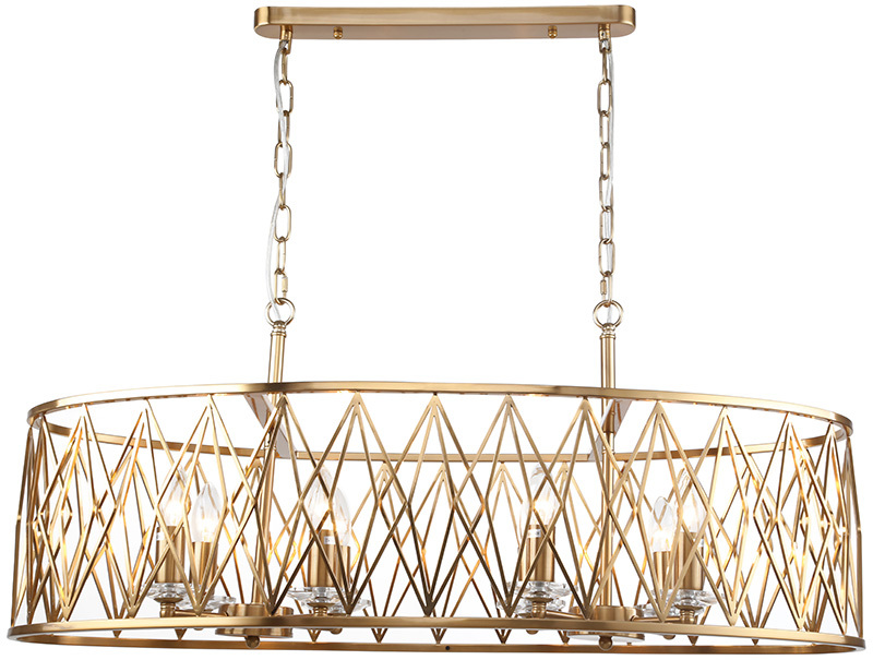 Люстра подвесная вытянутой формы из коллекции Rombik выполнена из металла, гальванизированного в цвет бронзы, и декорирована оригинальными металлическими элементами, напоминающими ромбы. Декоративные розетки выполнены из массива хрусталя ручной калибровки.