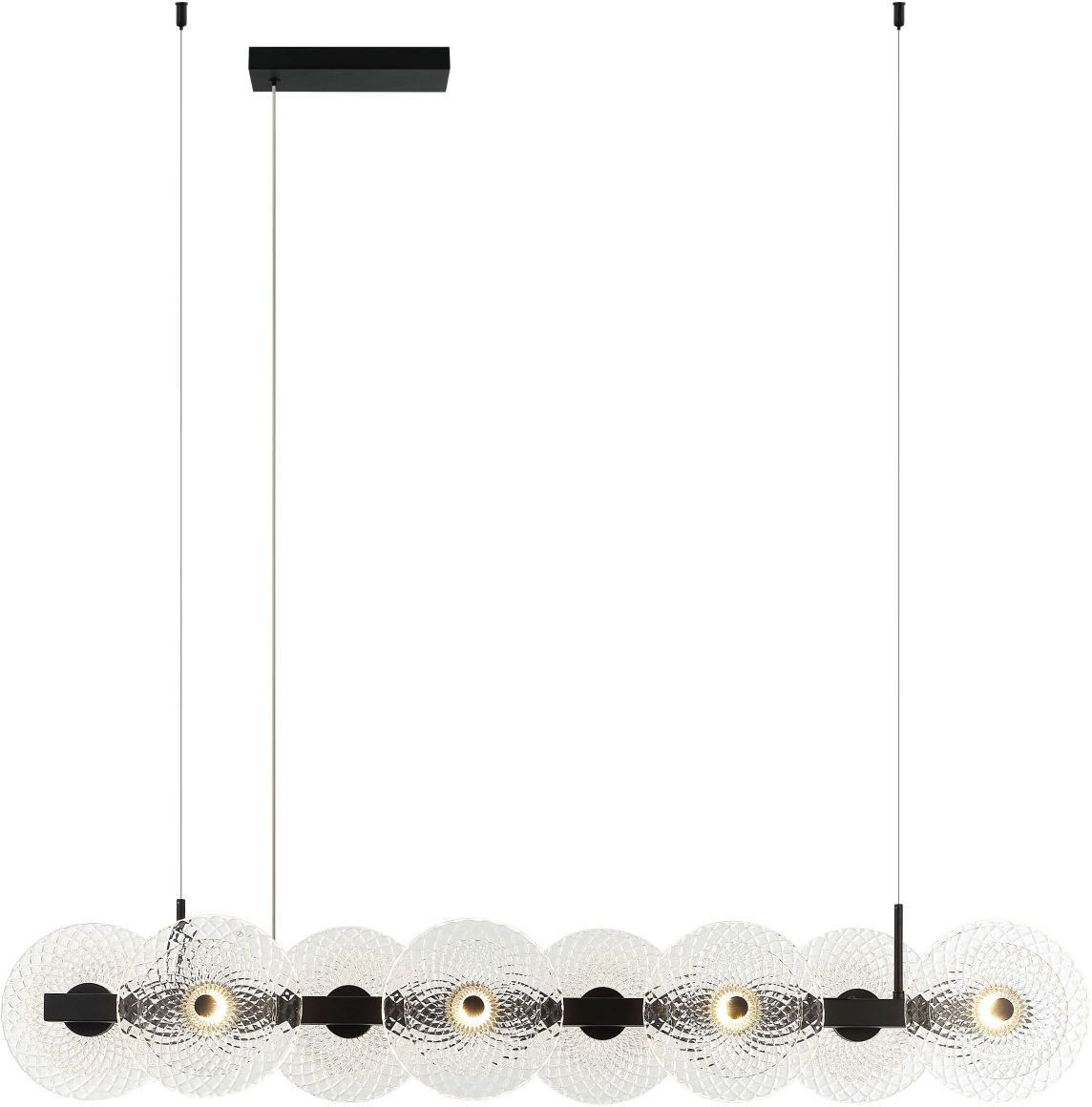 Люстра подвесная вытянутой формы эксклюзивной коллекции Sportu выполнена из металла и сплава алюминия черного цвета. Прозрачные плафоны имеют двойные стекла и текстурный рисунок. Светильник комплектуется драйвером высокого качества европейского стандарта T?V. Премиальное качество и неповторимый дизайн светильника идеально подойдут как в классические, так и современные интерьеры.