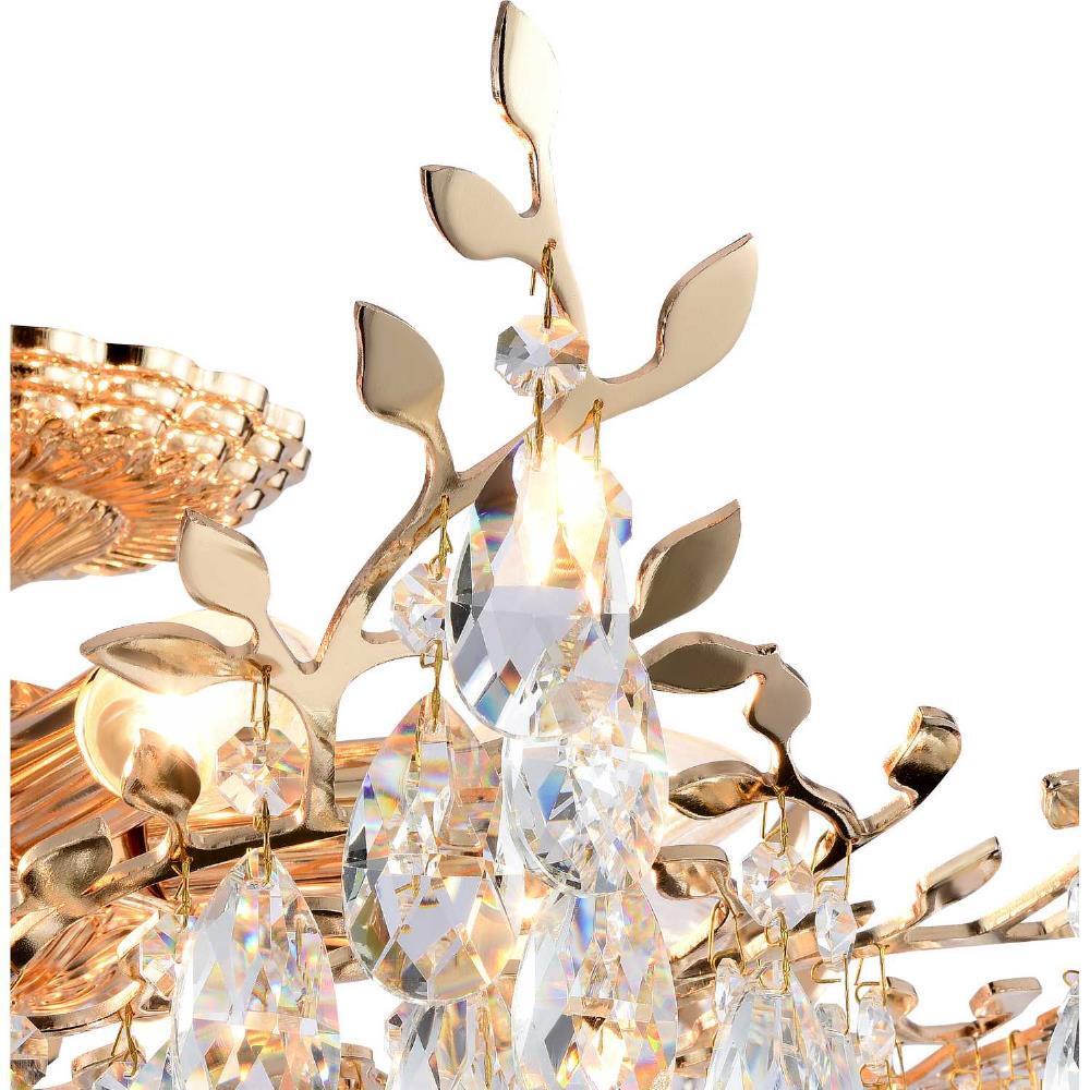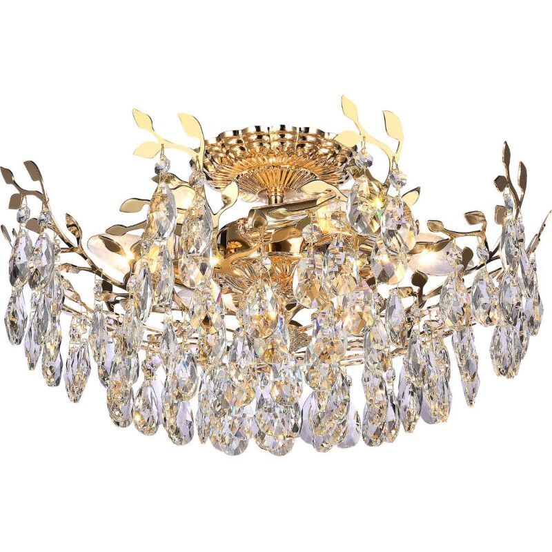 Люстра потолочная из коллекции Sofia выполнена из металла, гальванизированного в цвет золота, и декорирована прозрачным хрусталем высшей категории миндалевидной формы. Хрусталь крепится на декоративные металлические элементы в виде веток и листьев, гальванизированные в цвет арматуры .