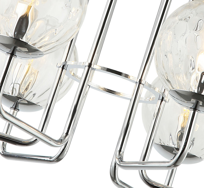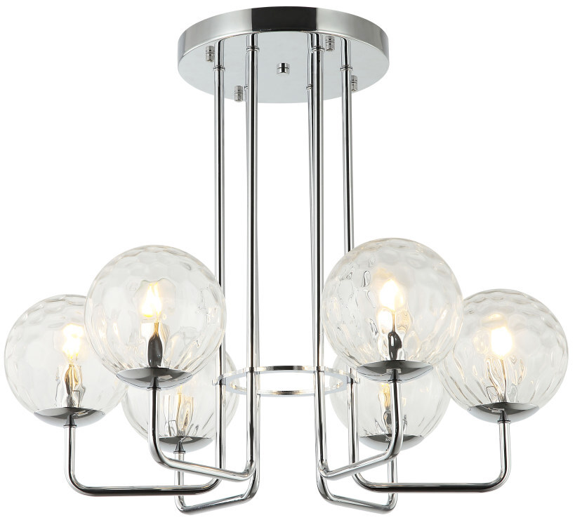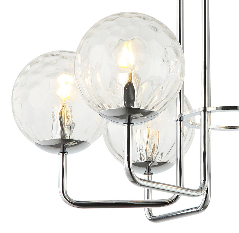 Люстра потолочная из коллекции Steely выполнена из металла, гальванизированного в цвет хрома, и декорирована прозрачными стеклянными плафонами с фактурой, нанесенной вручную точечной чеканкой. Премиальное качество и неповторимыи? дизаи?н светильников идеально подои?дут в современные и дизайнерские интерьеры.