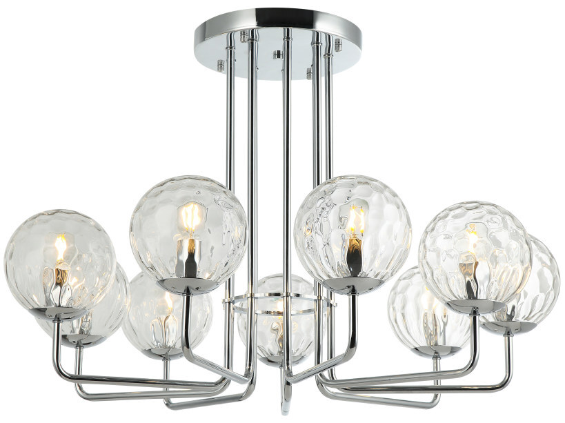 Люстра потолочная из коллекции Steely выполнена из металла, гальванизированного в цвет хрома, и декорирована прозрачными стеклянными плафонами с фактурой, нанесенной вручную точечной чеканкой. Премиальное качество и неповторимыи? дизаи?н светильников идеально подои?дут в современные и дизайнерские интерьеры.