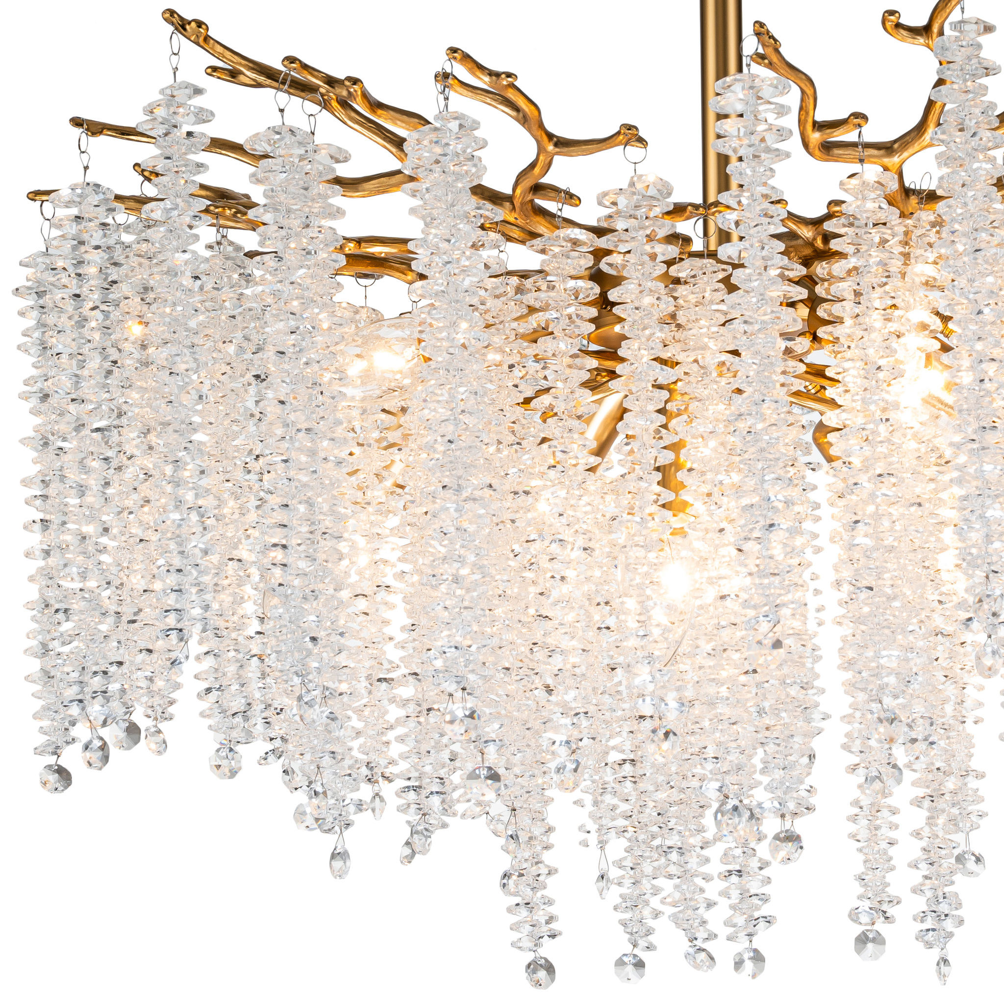 Люстра потолочная коллекции EIVA выполнена из сплава алюминия, гальванизирована в цвет бронзы и декорирована гроздьями из хрусталя в форме октагон. Светильники коллекции отличает увеличенное количество хрусталя (76 хрустальных гроздьев), фактурная чеканка на потолочной чаше и лампы с цоколем Е14. Из данной коллекции светильников можно сделать индивидуальный заказ любого цвета и размера.