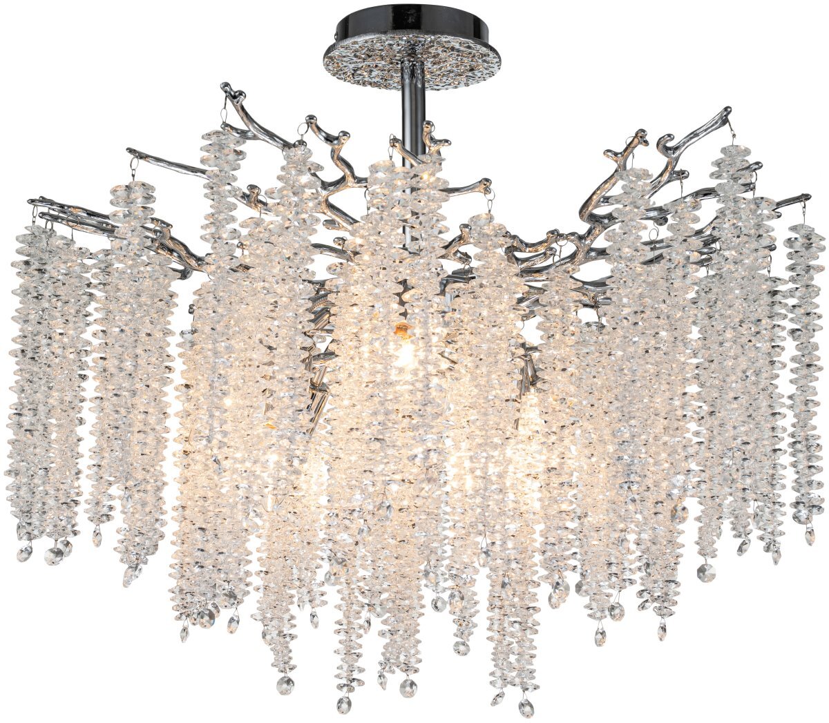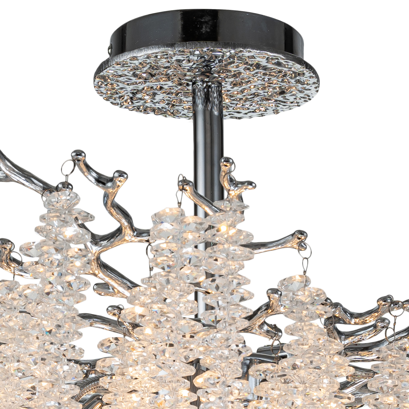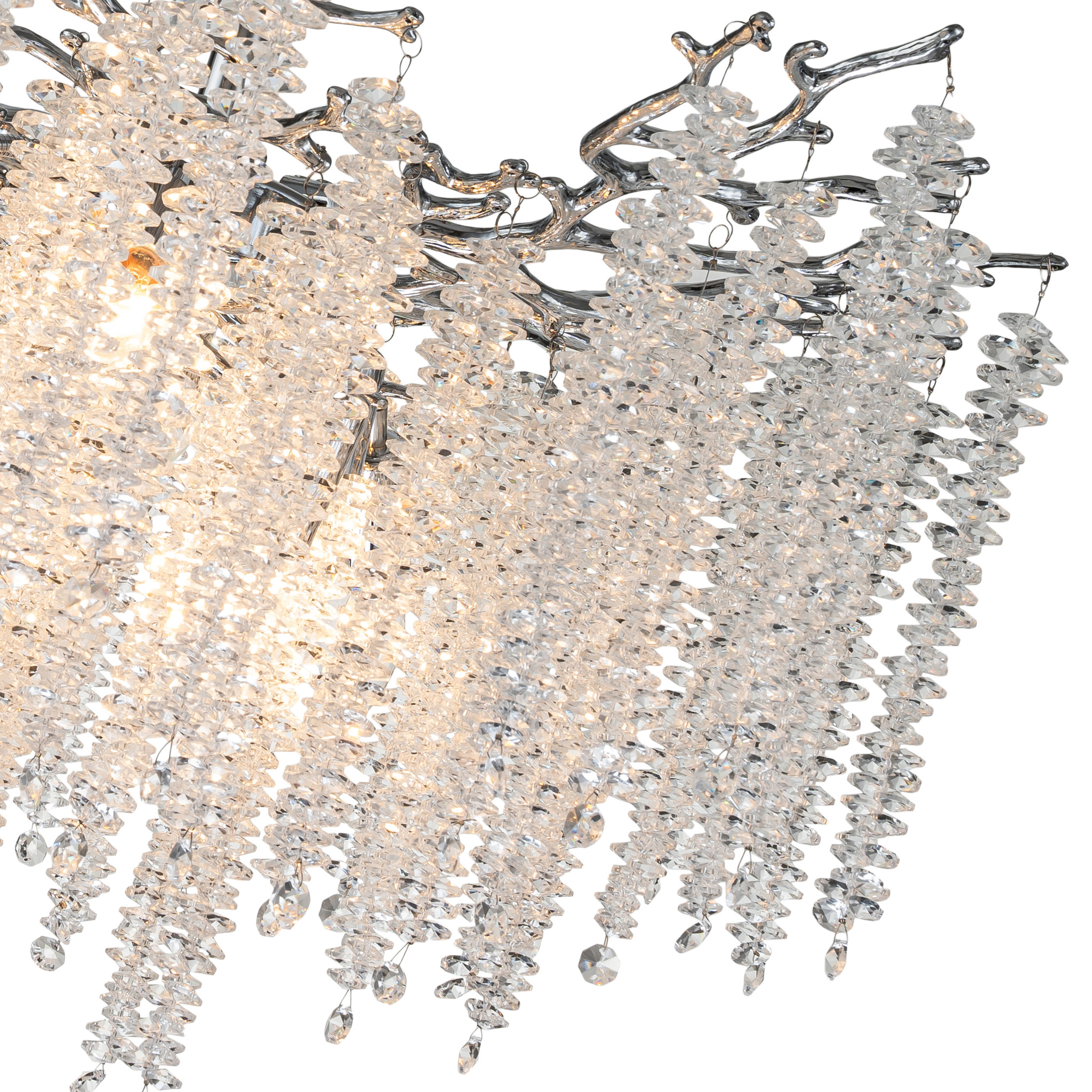 Люстра потолочная коллекции EIVA выполнена из сплава алюминия, гальванизирована в цвет хрома и декорирована гроздьями из хрусталя в форме октагон. Светильники коллекции отличает увеличенное количество хрусталя (76 хрустальных гроздьев), фактурная чеканка на потолочной чаше и лампы с цоколем Е14. Из данной коллекции светильников можно сделать индивидуальный заказ любого цвета и размера.