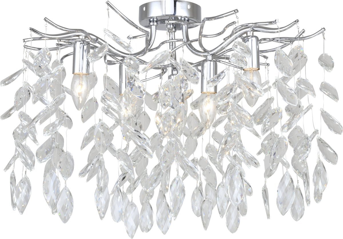 Люстра потолочная коллекции RAMO выполнена из металла, гальванизированного в цвет хрома, и декорирована гроздьями из хрусталя винтажной формы. Отличительной особенностью данной коллекции является ручное изготовление каркаса с дополнительной полировкой стыков арматуры и увеличенным количеством хрустальных подвесок (42 веточки по 5 кристаллов).