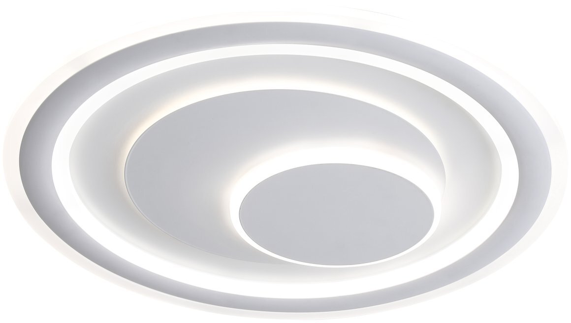 Люстра потолочная коллекции Strim выполнена из железа, окрашенного в белый цвет, и рассеивателя из оптического силикона. Модель этой коллекции комплектуется пультом дистанционного управления с функцией диммирования и переключения режимов цветовой температурой 3000К - 6500К, что позволяет настроить любые оттенки теплого, нейтрального и холодного. Функциональной возможностью данного светильника является переключение различных режимов работы RGB подсветки.