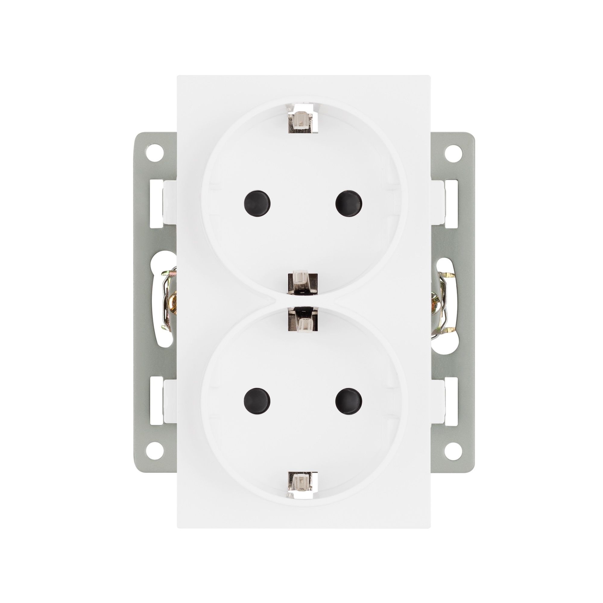 Механизм розетки вертикальный, с заземлением на 2 поста и с суппортом из алюминия. Цвет - белый. Степень пылевлагозащиты - IP20. Устанавливается в сдвоенный круглый подрозетник 220V. Рабочее напряжение 110-250V. Макс. ток нагрузки 16А. Габаритные размеры: длина 74 мм, ширина 93 мм, высота 35 мм. Гарантийный срок 10 лет.
