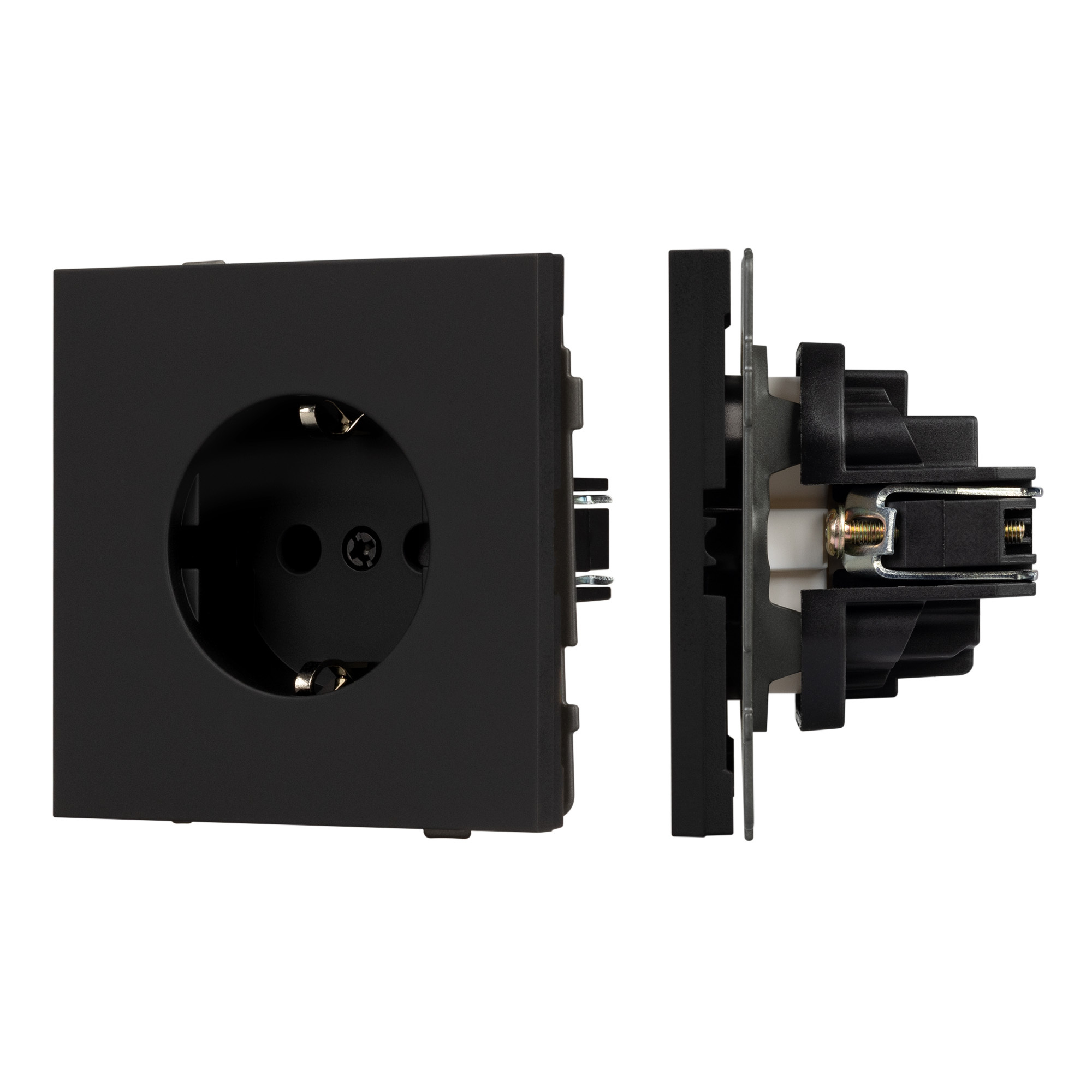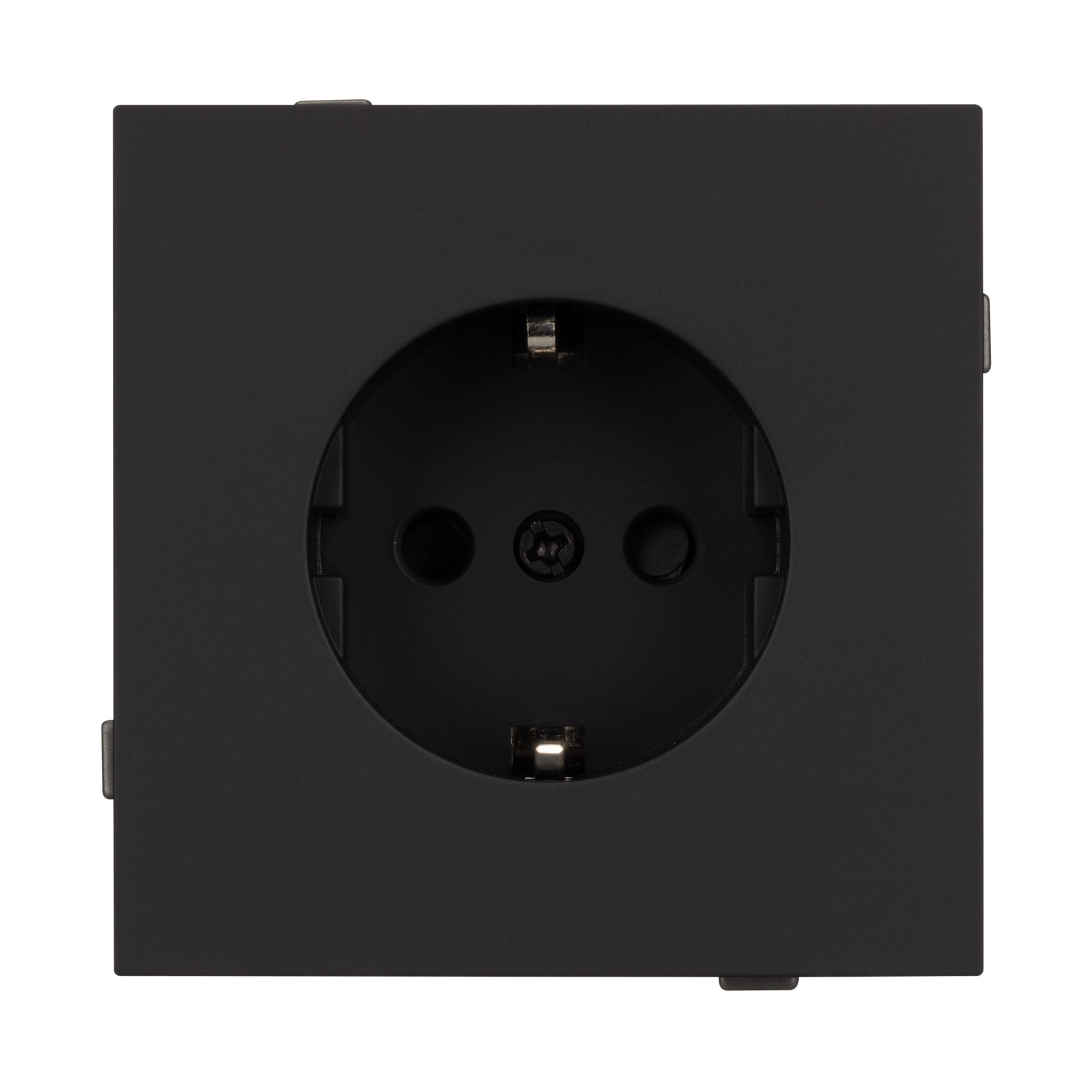 Механизм розетки с заземлением на 1 пост. Цвет - черный, с Soft-Touch покрытием. Без фронтальной рамки. Уровень пылевлагозащиты IP20. Розетка устанавливается в стандартный подрозетник круглого сечения диаметром 60мм. Габаритные размеры: длина 71 мм, ширина 71 мм, высота 44 мм. Гарантийный срок 10 лет.