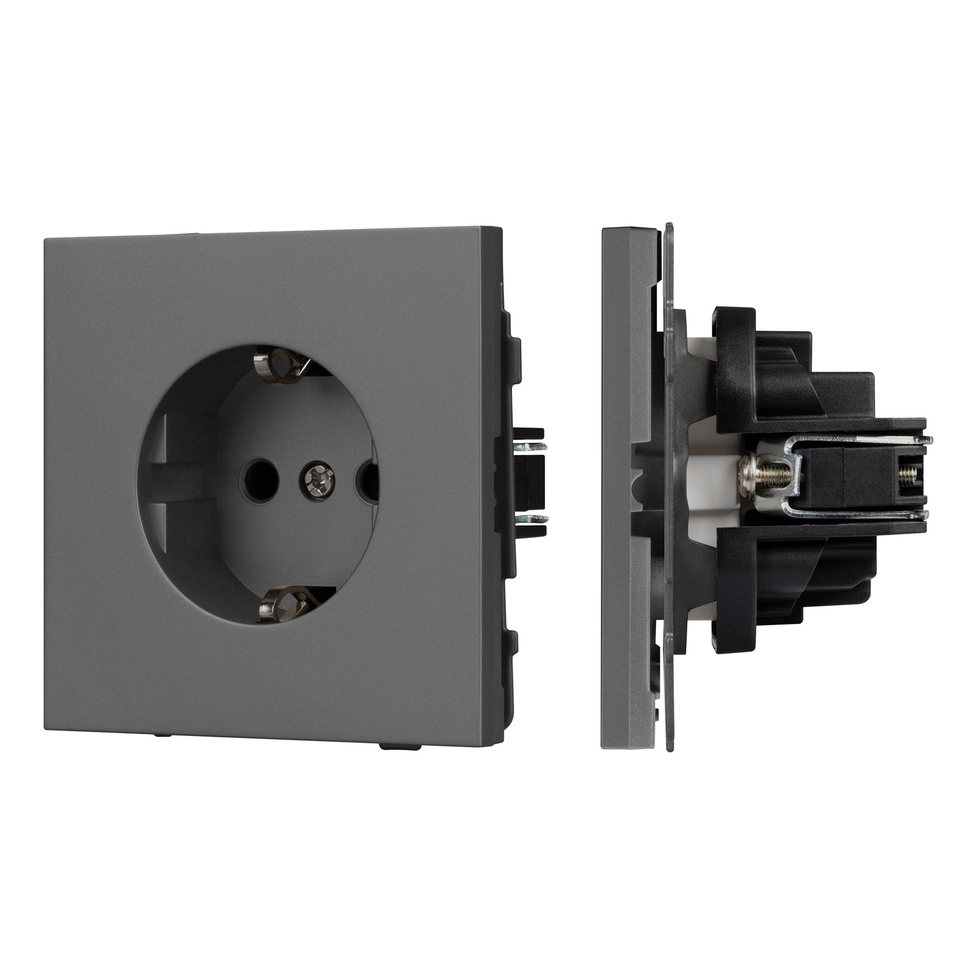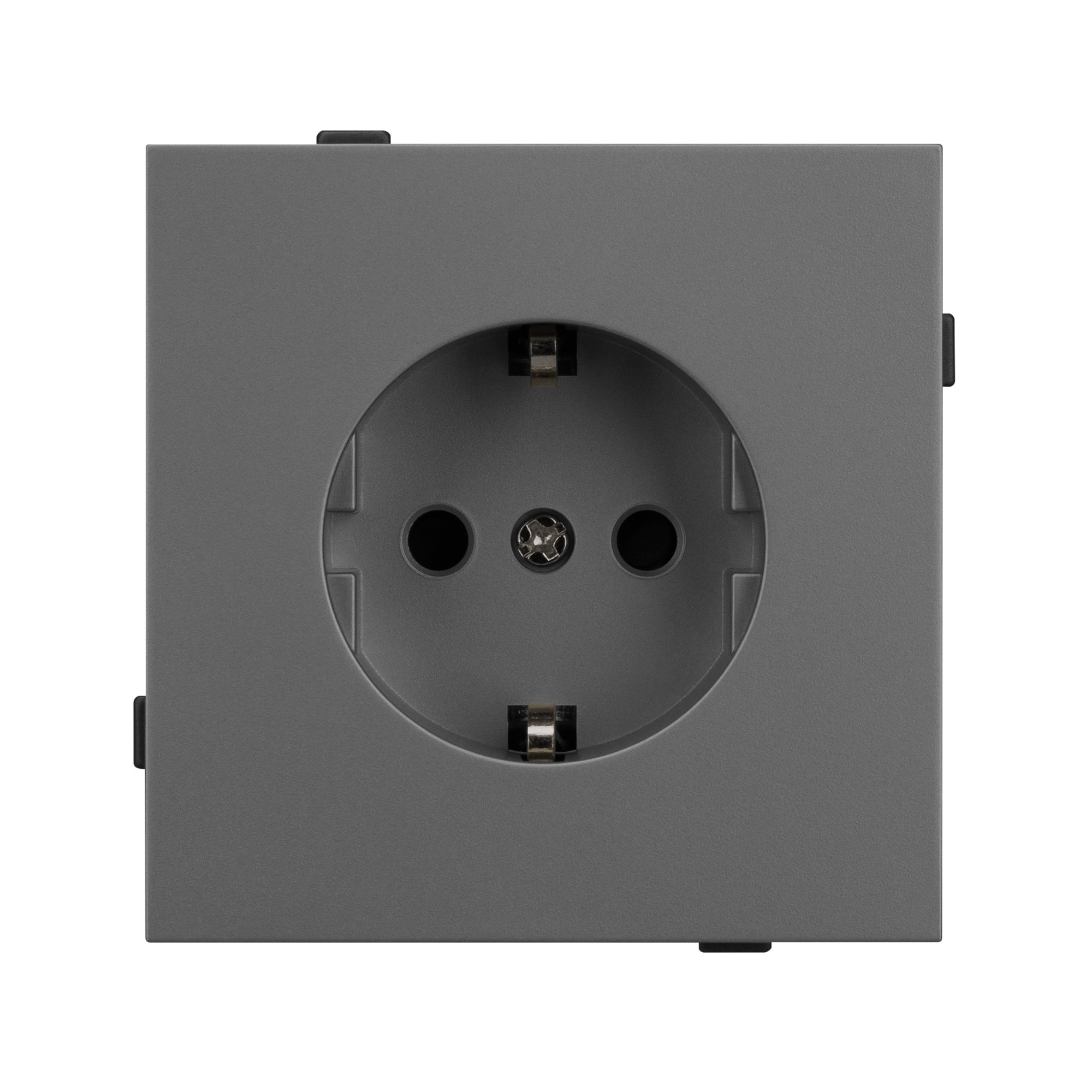 Механизм розетки с заземлением на 1 пост. Цвет - серый, с Soft-Touch покрытием. Без фронтальной рамки. Уровень пылевлагозащиты IP20. Розетка устанавливается в стандартный подрозетник круглого сечения диаметром 60мм. Габаритные размеры: длина 71 мм, ширина 71 мм, высота 44 мм. Гарантийный срок 10 лет.