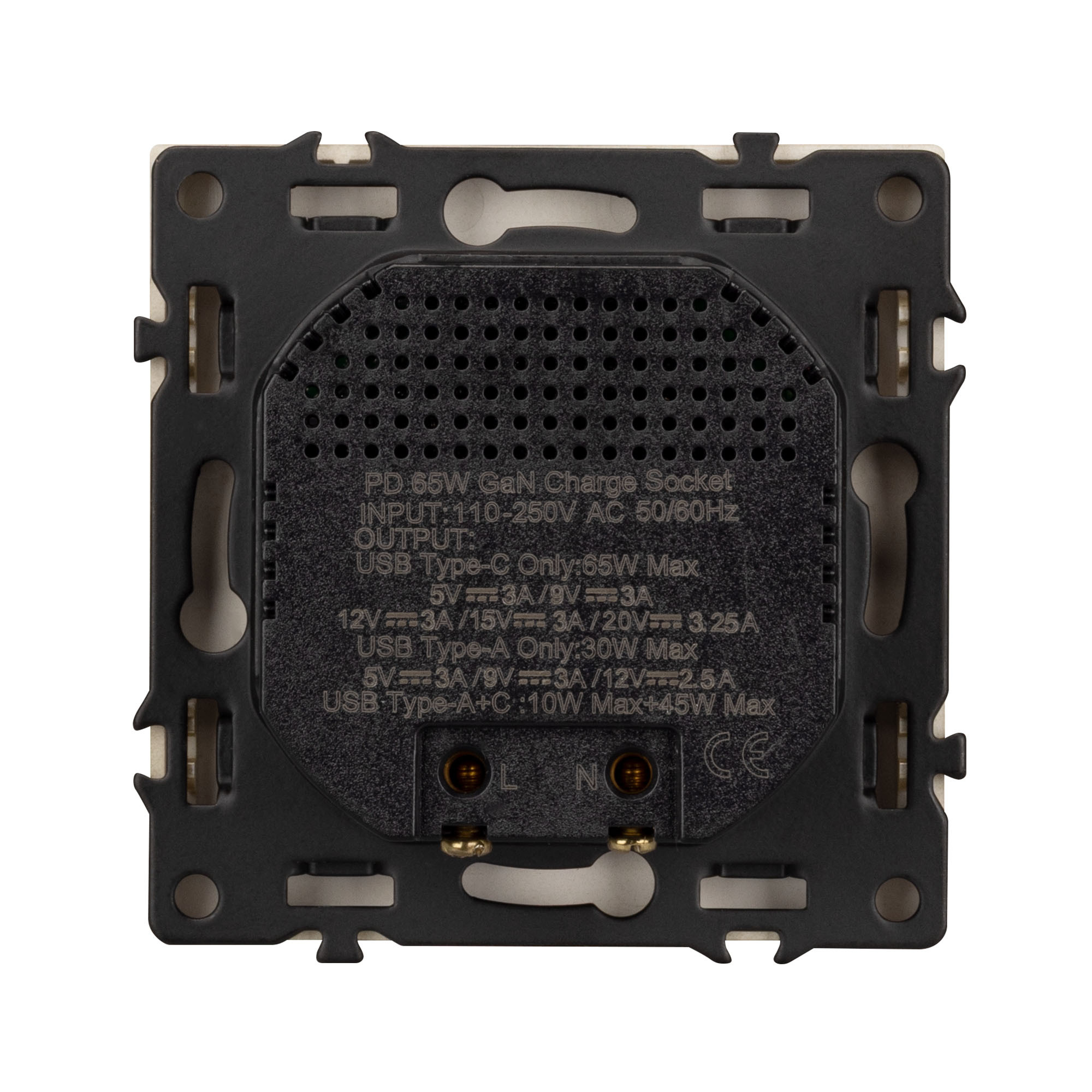 Механизм розетки с быстрой USB зарядкой на 2 порта. Цвет - золотой, с Soft-Touch покрытием. Без фронтальной рамки. Уровень пылевлагозащиты IP20. Тип подключаемого разъема - USB Type A + Type C. Устанавливается в стандартный подрозетник круглого сечения диаметром 60мм. Габаритные размеры: длина 71 мм, ширина 71 мм, высота 42 мм. Гарантийный срок 10 лет.