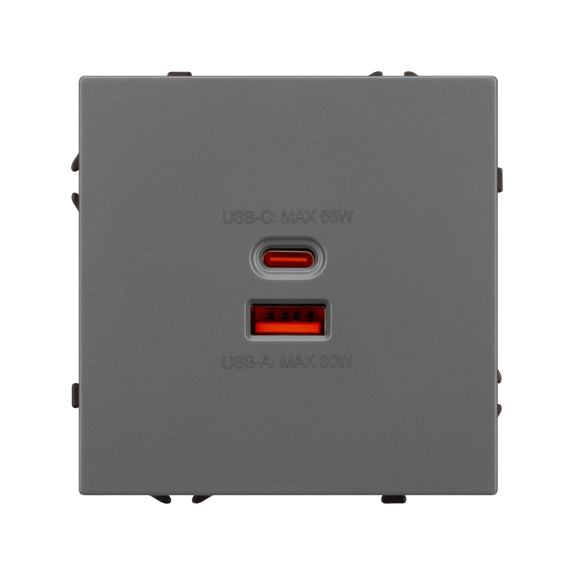 Механизм розетки с быстрой USB зарядкой на 2 порта. Цвет - серый, с Soft-Touch покрытием. Без фронтальной рамки. Уровень пылевлагозащиты IP20. Тип подключаемого разъема - USB Type A + Type C. Устанавливается в стандартный подрозетник круглого сечения диаметром 60мм. Габаритные размеры: длина 71 мм, ширина 71 мм, высота 42 мм. Гарантийный срок 10 лет.