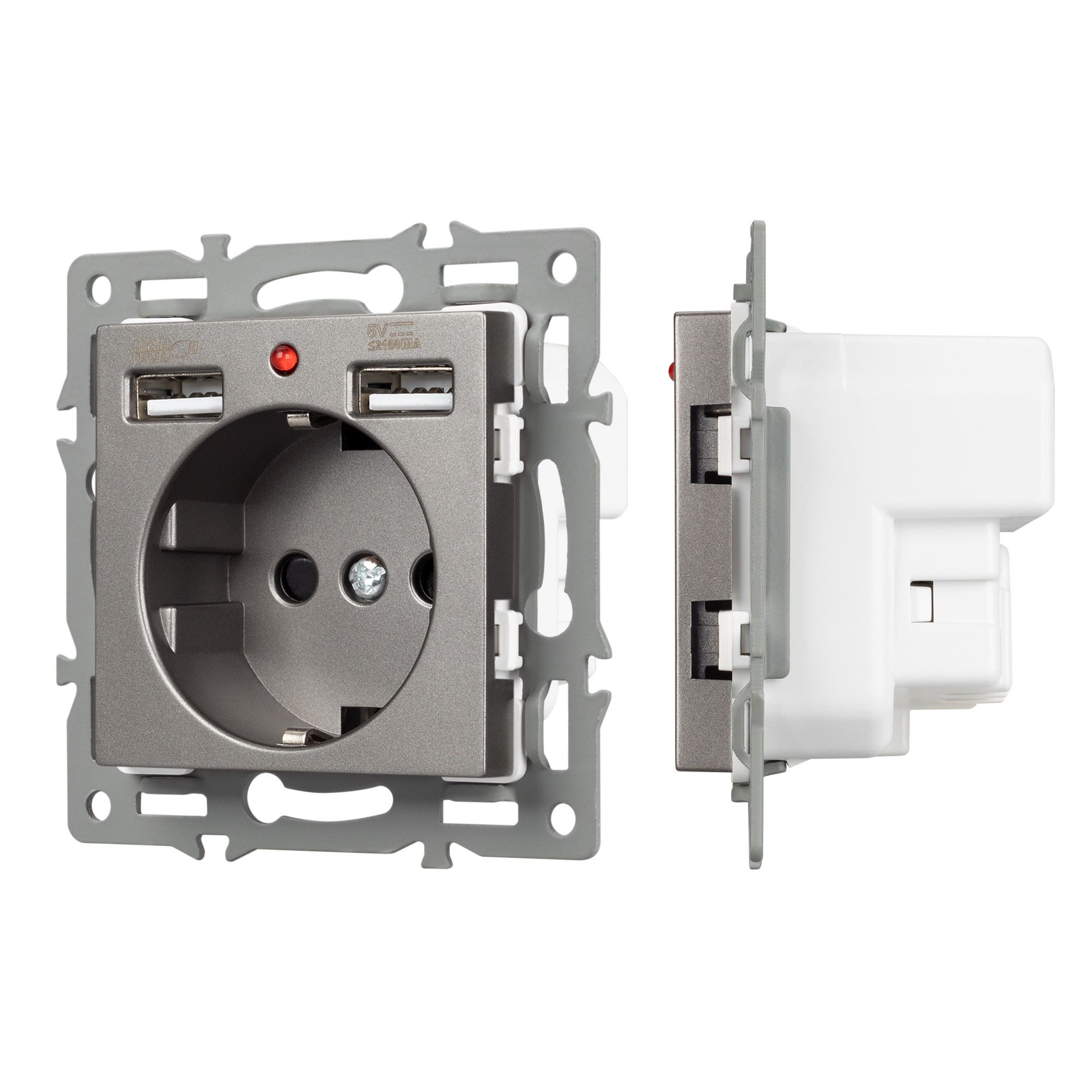 Механизм розетки с заземлением 1 пост 2 USB Type-A, с суппортом из алюминия. Цвет - серый. Степень пылевлагозащиты - IP20. Устанавливается в стандартный круглый подрозетник 220V (Арт.044895). Рабочее напряжение 110-250V. Макс. ток нагрузки 16А. Габаритные размеры: длина 74 мм, ширина 74 мм, высота 44 мм. Гарантийный срок 10 лет.