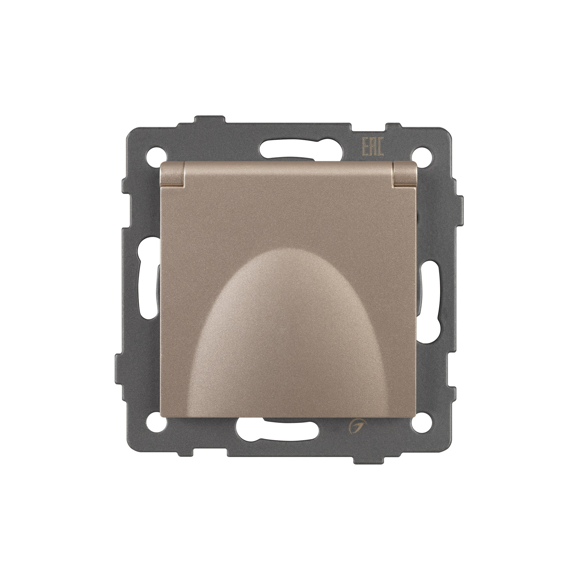 Механизм розетки с заземлением на 1 пост с влагозащитной крышкой. Цвет - золотой. Без фронтальной рамки. Уровень пылевлагозащиты IP44. Устанавливается в стандартный подрозетник. Габаритные размеры: длина 71 мм, ширина 71 мм, высота 52 мм. Гарантийный срок 10 лет.