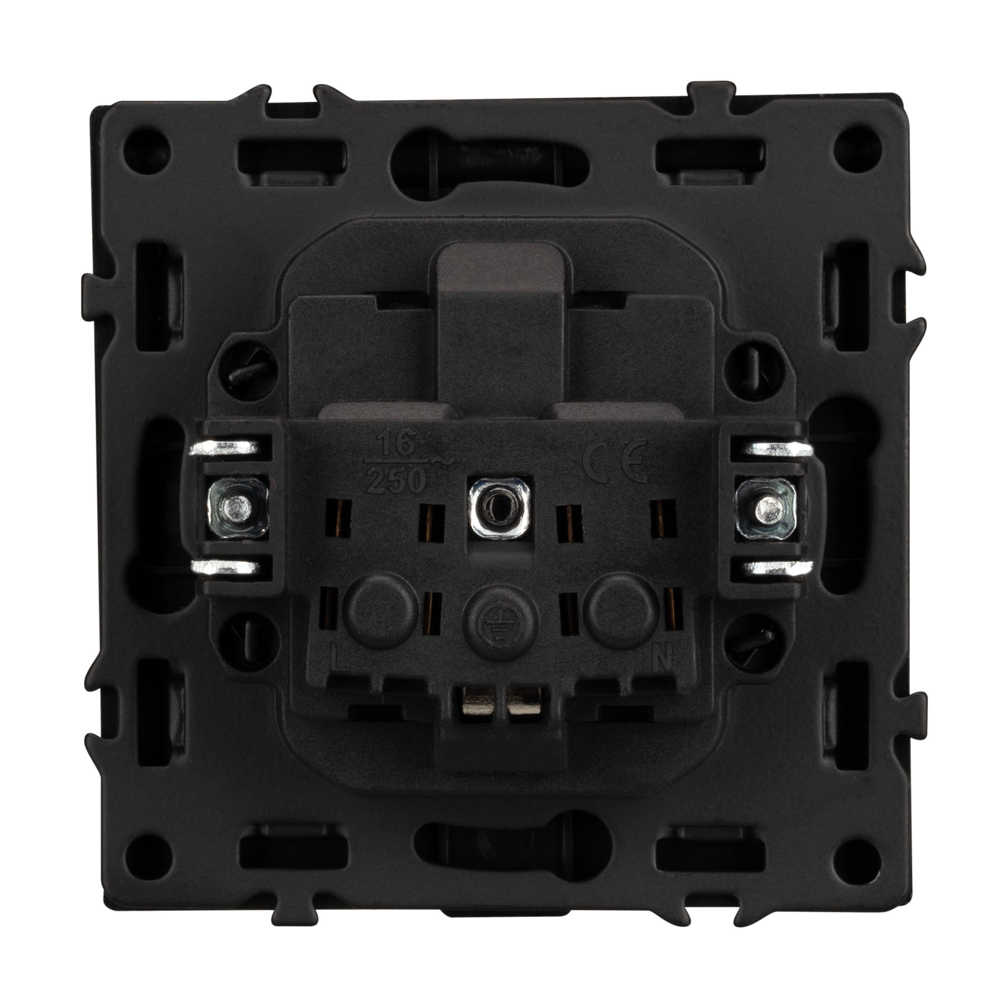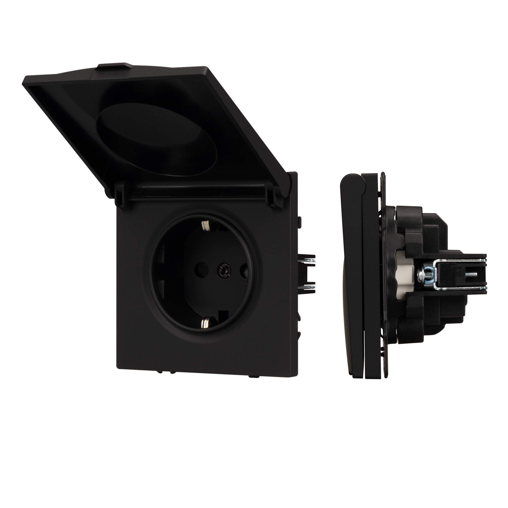 Механизм розетки с заземлением и влагозащитной крышкой на 1 пост. Цвет - черный, с Soft-Touch покрытием. Без фронтальной рамки. Уровень пылевлагозащиты IP44. Розетка устанавливается в стандартный подрозетник круглого сечения диаметром 60мм. Габаритные размеры: длина 71 мм, ширина 71 мм, высота 45 мм. Гарантийный срок 10 лет.