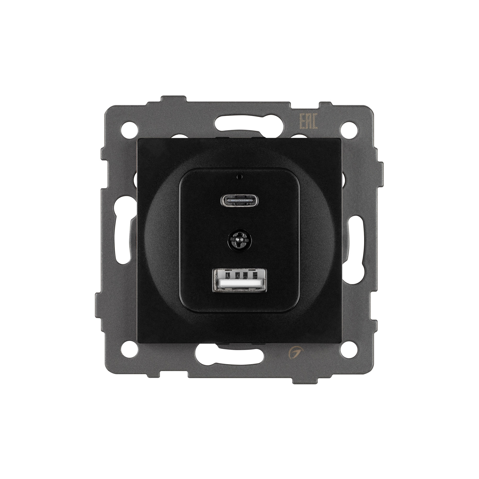 Механизм розетки с заземлением на 2 USB type A+C порта. Цвет - черный. Без фронтальной рамки. Уровень пылевлагозащиты IP20. Устанавливается в стандартный подрозетник. Габаритные размеры: длина 71 мм, ширина 71 мм, высота 42 мм. Гарантийный срок 10 лет.