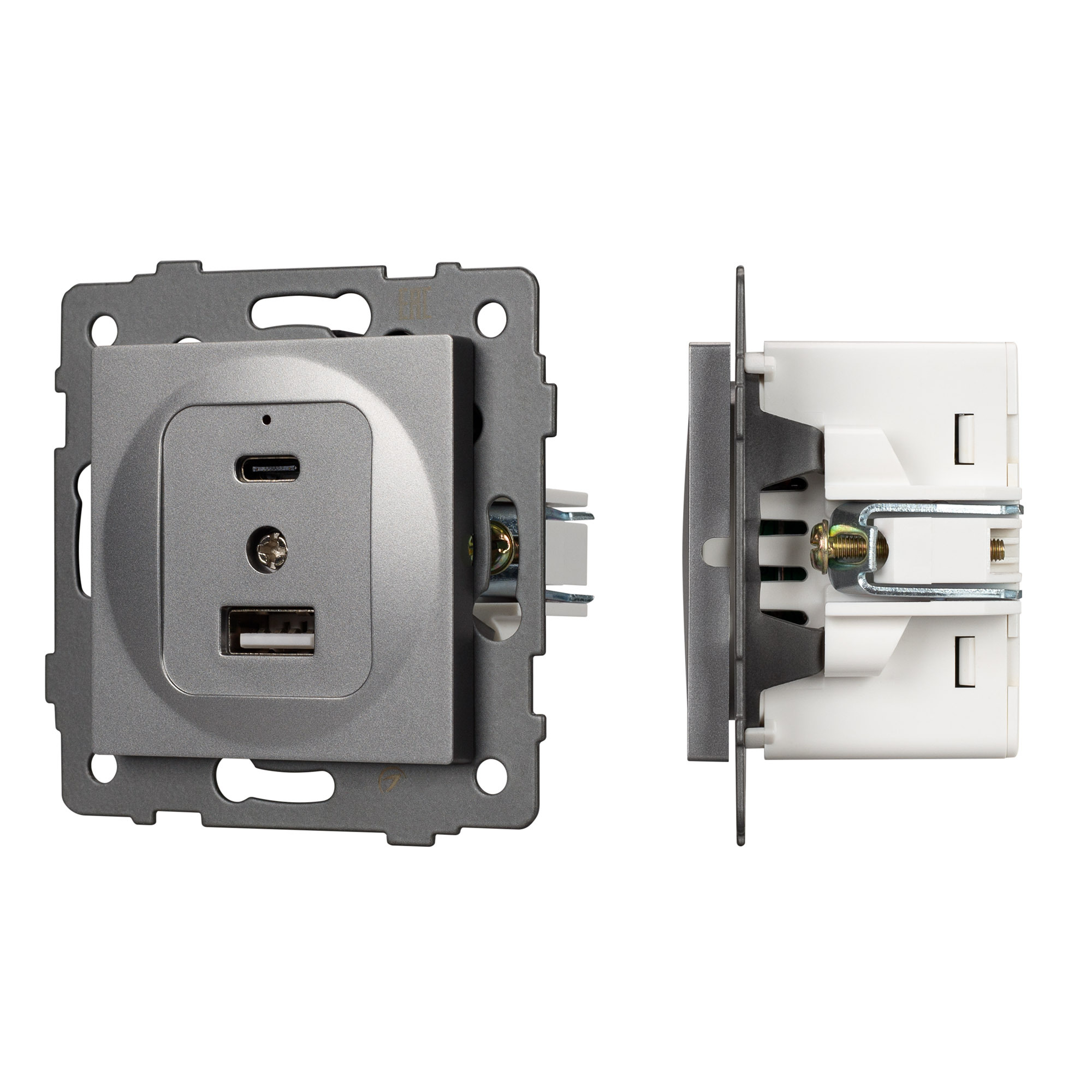 Механизм розетки с заземлением на 2 USB type A+C порта. Цвет - серый. Без фронтальной рамки. Уровень пылевлагозащиты IP20. Устанавливается в стандартный подрозетник. Габаритные размеры: длина 71 мм, ширина 71 мм, высота 42 мм. Гарантийный срок 10 лет.