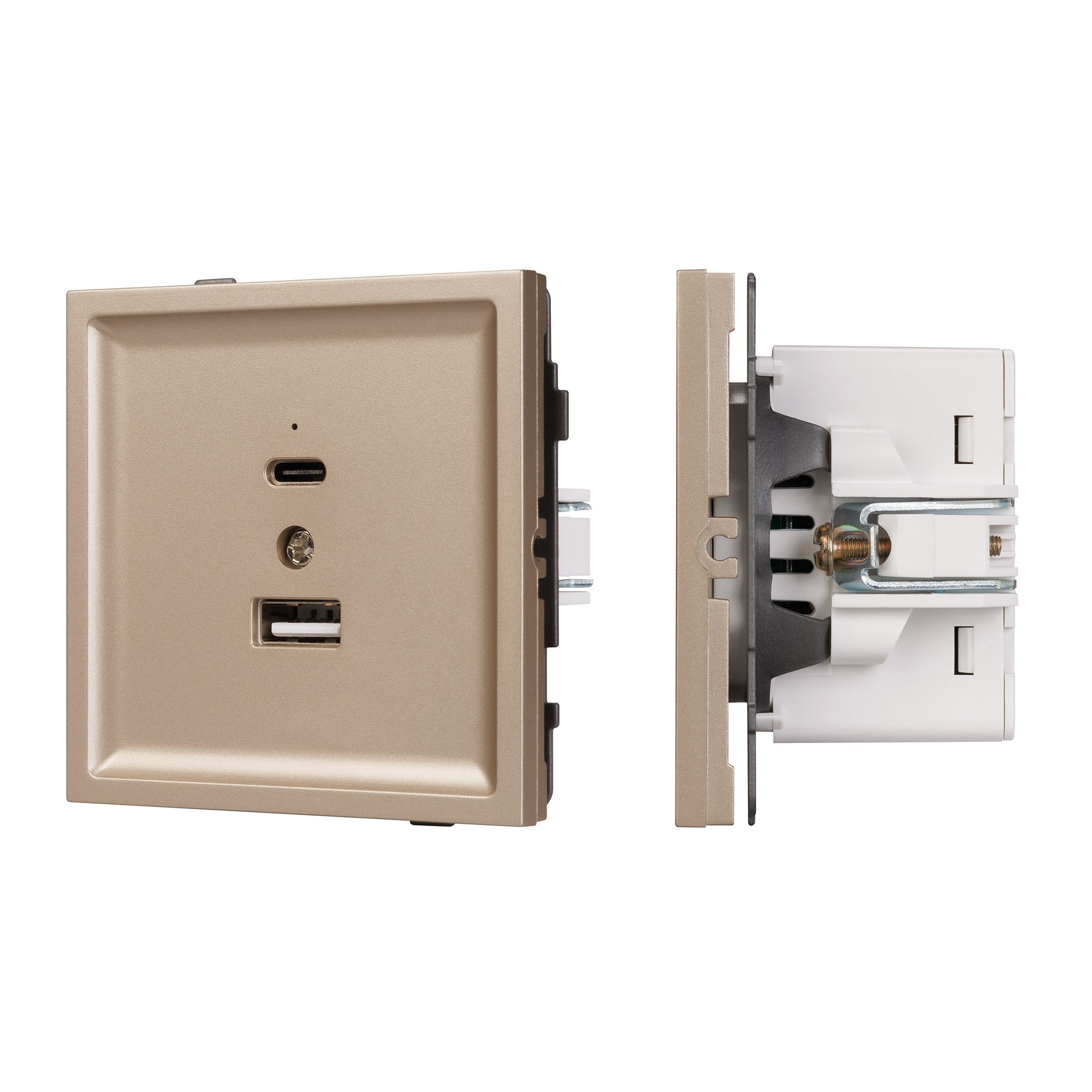 Механизм USB розетки на 2 порта Type A + Type C. Цвет - золотой. Без фронтальной рамки. Выходная мощность для USB Type C порта не превышает 20W. Уровень пылевлагозащиты IP20. Устанавливается в стандартный подрозетник круглого сечения диаметром 60мм. Габаритные размеры: длина 71 мм, ширина 71 мм, высота 42 мм. Гарантийный срок 10 лет.