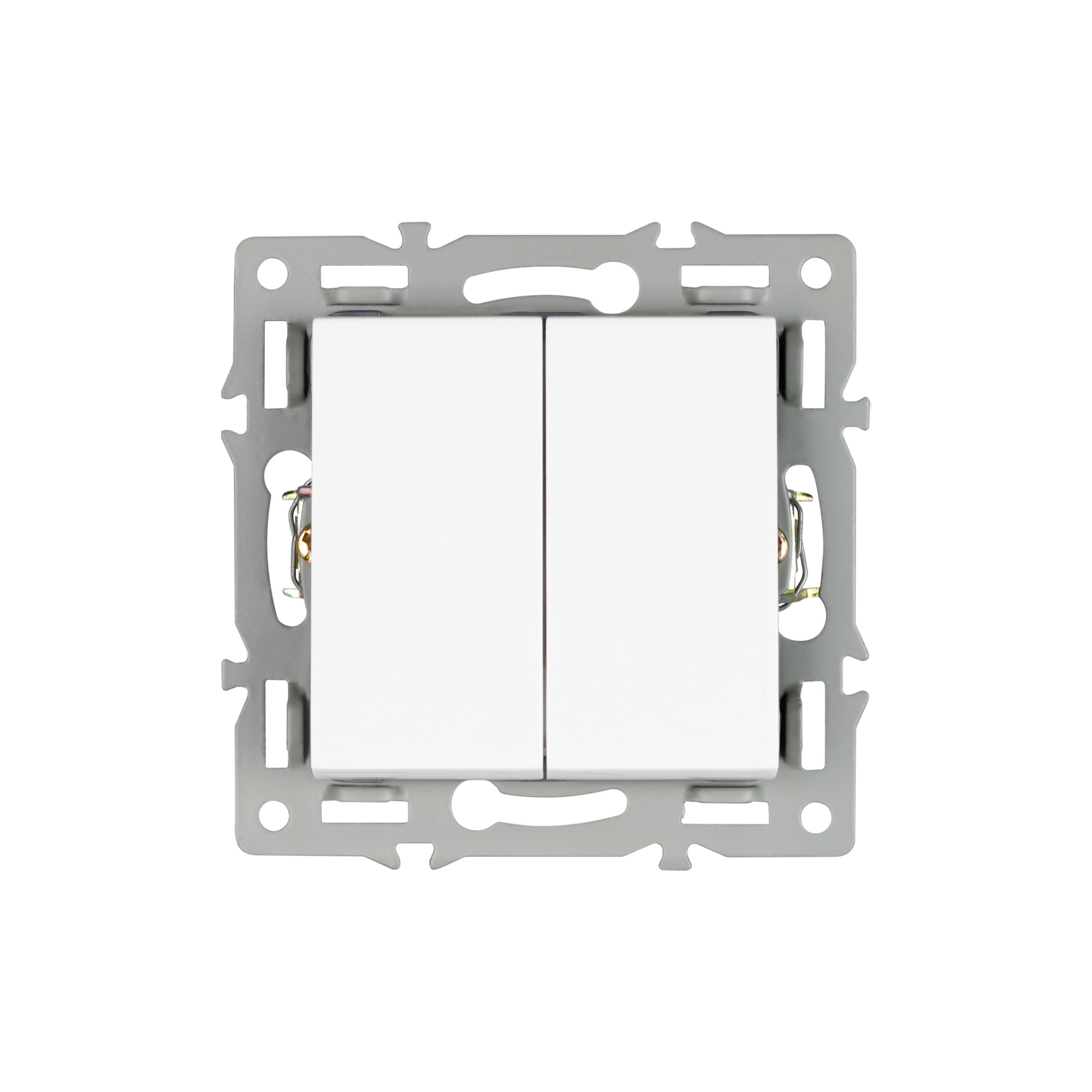 Механизм выключателя клавишный на 1 пост 2 клавиши (непроходной), с суппортом из алюминия. Цвет - белый. Степень пылевлагозащиты - IP20. Устанавливается в стандартный круглый подрозетник 220V (Арт.044895). Рабочее напряжение 110-250V. Макс. ток нагрузки 16А. Габаритные размеры: длина 74 мм, ширина 74 мм, высота 35 мм. Гарантийный срок 10 лет.