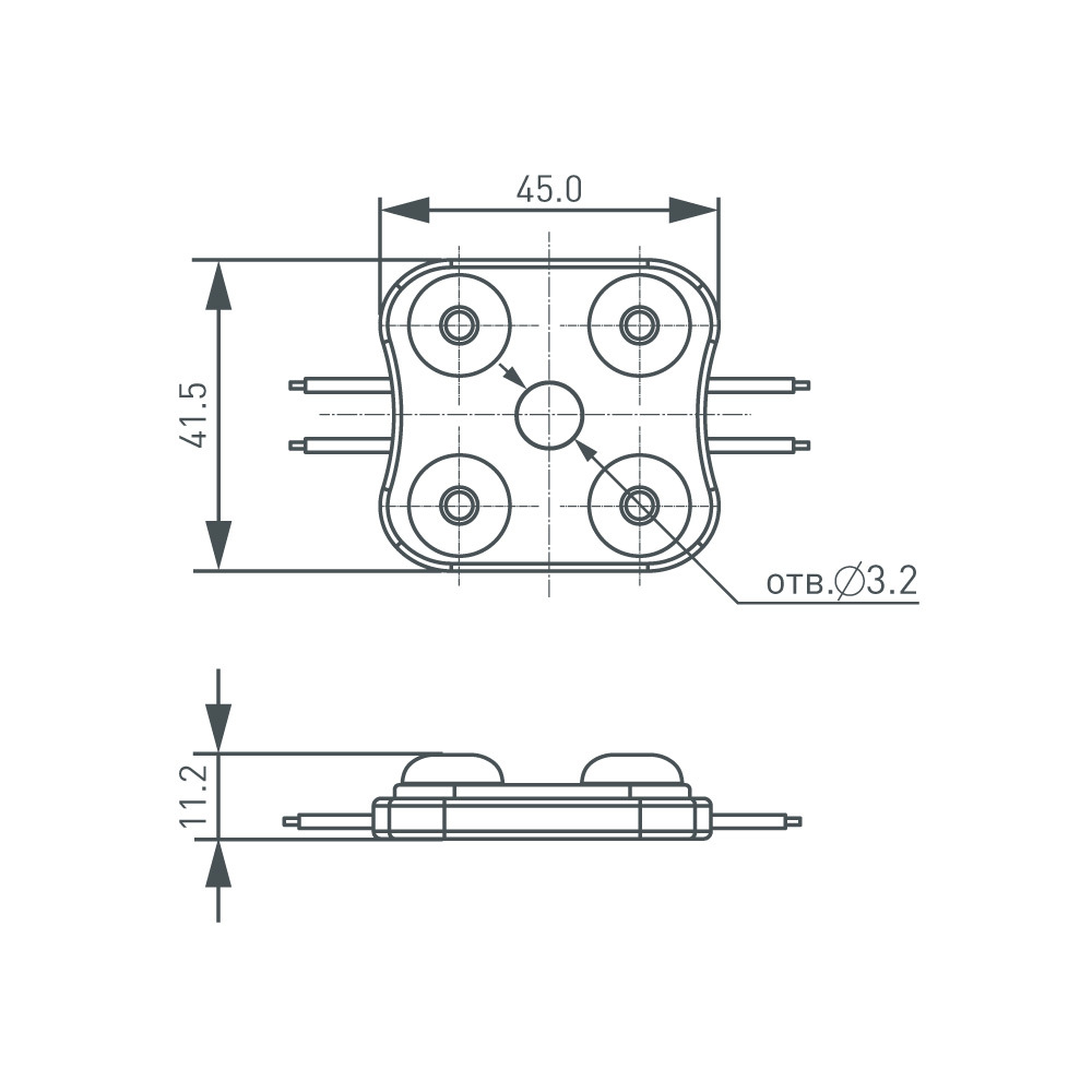Герметичный светодиодный модуль IP67, ХОЛОДНЫЙ 7500–8000 К, напряжение 12 В, мощность 1.2 Вт, св. поток 180 лм, 4 светодиода SMD 2835, угол 170°. 20 шт на проводе, расстояние между центрами модулей 255 мм, длина провода между модулями 210 мм, рекомендуемая глубина установки 120–300 мм. Размер 45х41.5х11.2 мм. Гарантия 5 лет. Высокая эффективность - 150 лм/Вт. Технология Constant Current