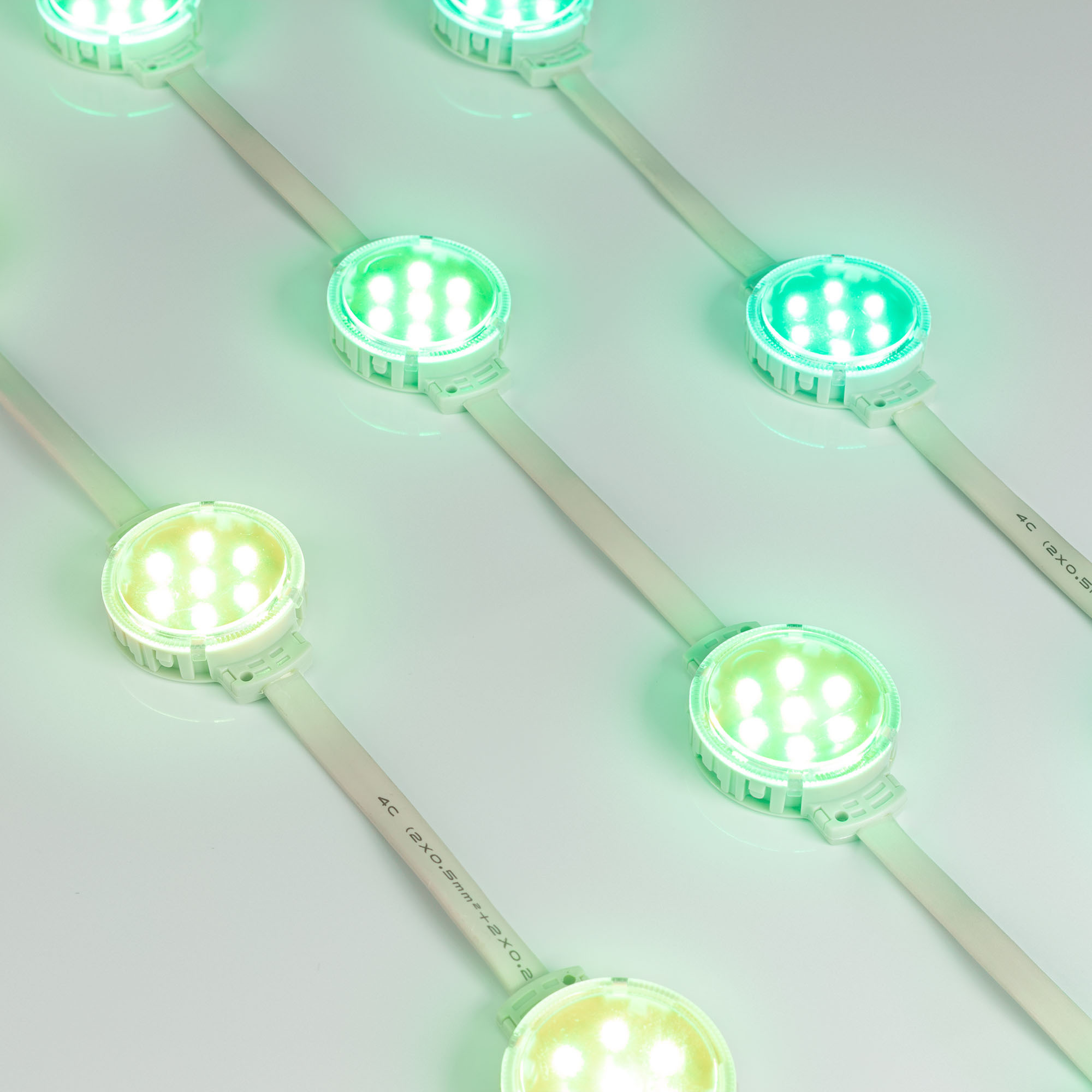 Управляемый светодиодный модуль SPI, RGB, микросхема MT26803 (аналог UCS1903), напряжение 24 В, мощность 1.25 Вт, 7 светодиодов SMD 3535, угол 120°. Создание медиафасадов, 30 шт на проводе, расстояние между центрами модулей 170 мм, длина провода между модулями 110 мм. Степень пылевлагозащиты IP68. Размер Ø50×66×16 мм. Гарантия 3 года.