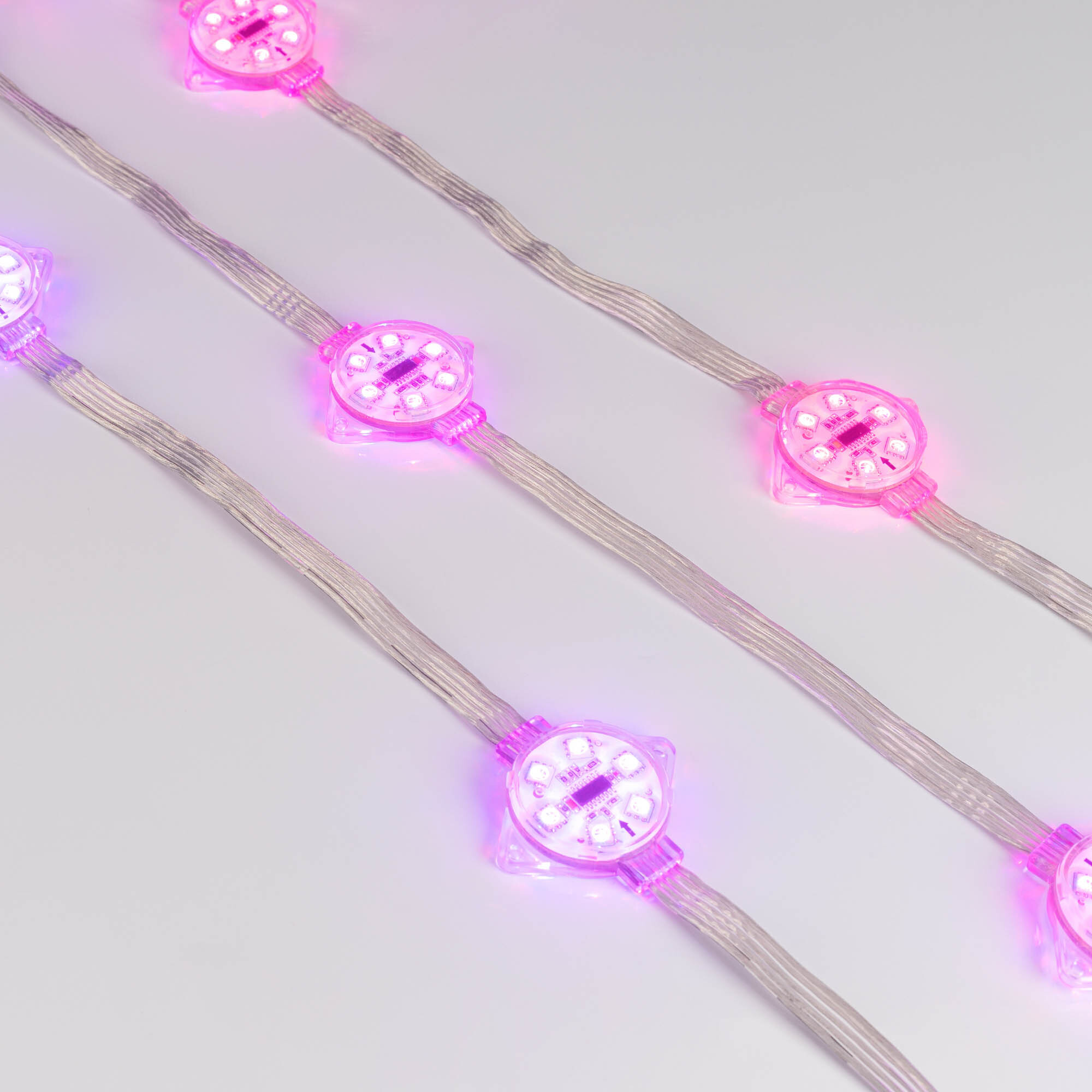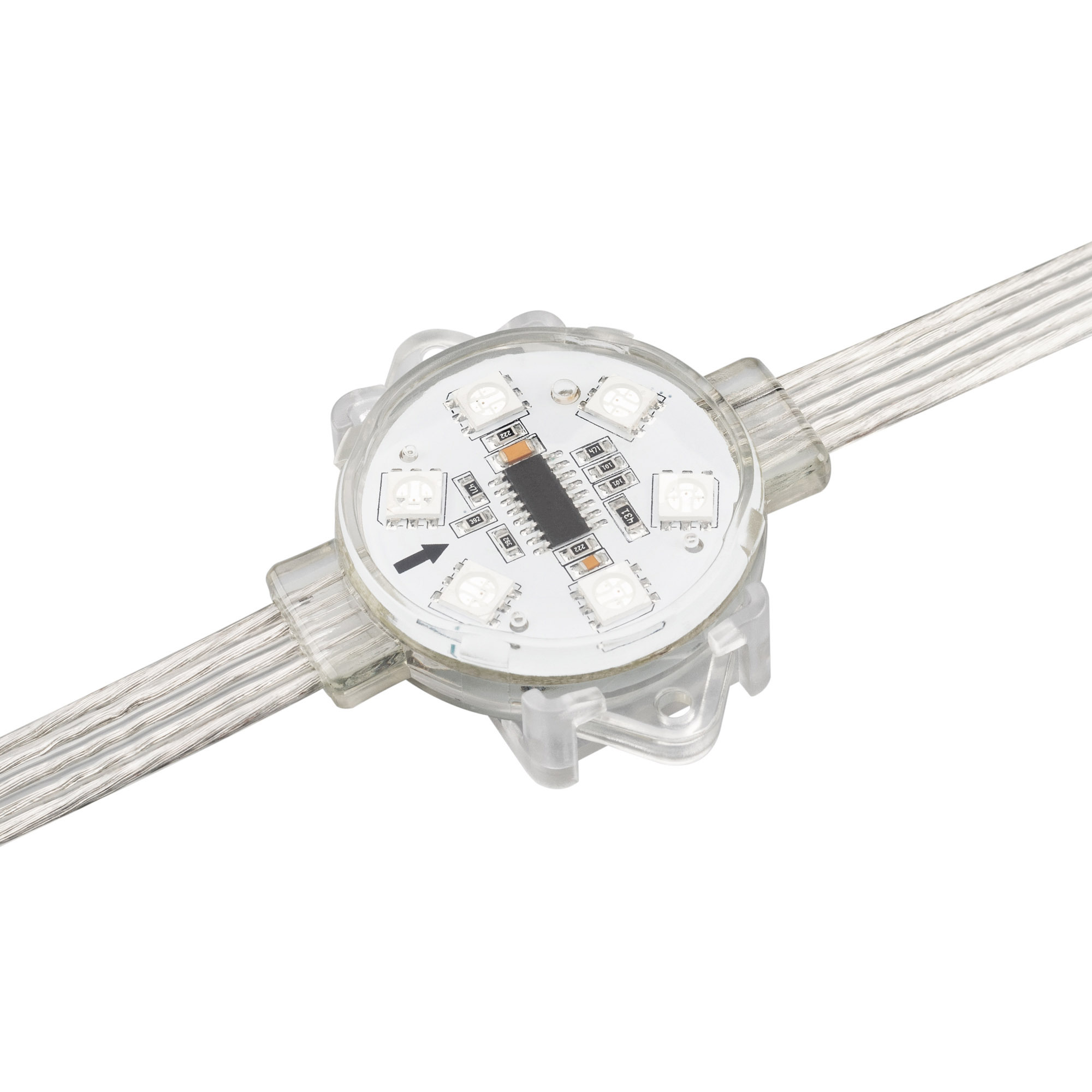 Управляемый светодиодный модуль DMX с держателем, RGB, микросхема TM512AС, напряжение 24 В, мощность 1.5 Вт, 6 светодиодов SMD 5060, угол 120°. Создание медиафасадов. 20 шт на цепочке, 2 цепочки в пакете, расстояние между центрами модулей 240 мм, длина провода между модулями 200 мм. IP68. Размер Ø40×12 мм. Гарантия 3 года. В комплекте инжектор питания.
