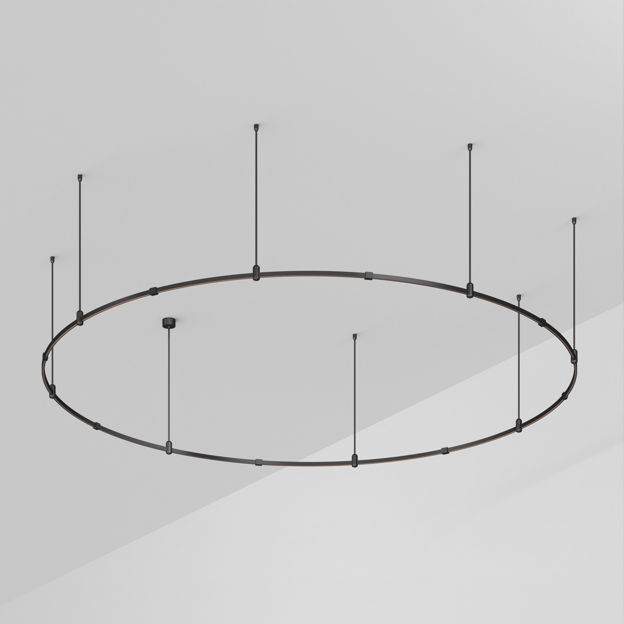 Подвесная конструкция APRIORI, форма круг. В комплекте треки с аксессуарами и жесткими подвесами длиной 800мм. DC48V. Материал алюминий, цвет черный. Размер: диаметр 3000мм, высота 22мм. Светильники и источники питания приобретаются отдельно.