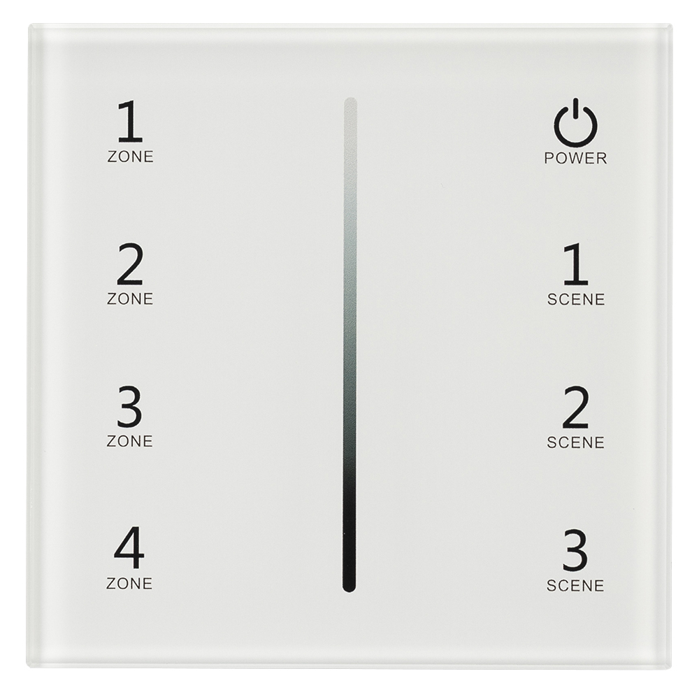 Встраиваемая сенсорная стеклянная панель 2.4 ГГц, цвет белый. Для управления яркостью с помощью сенсорной полосы. Питание/рабочее напряжение AC 100-240V, 4 зоны управления, память 4 сцен. Функция управления DMX512 устройствами. Габариты 86х86х36 мм. Панель совместима с диммерами и пультами серии SMART.
