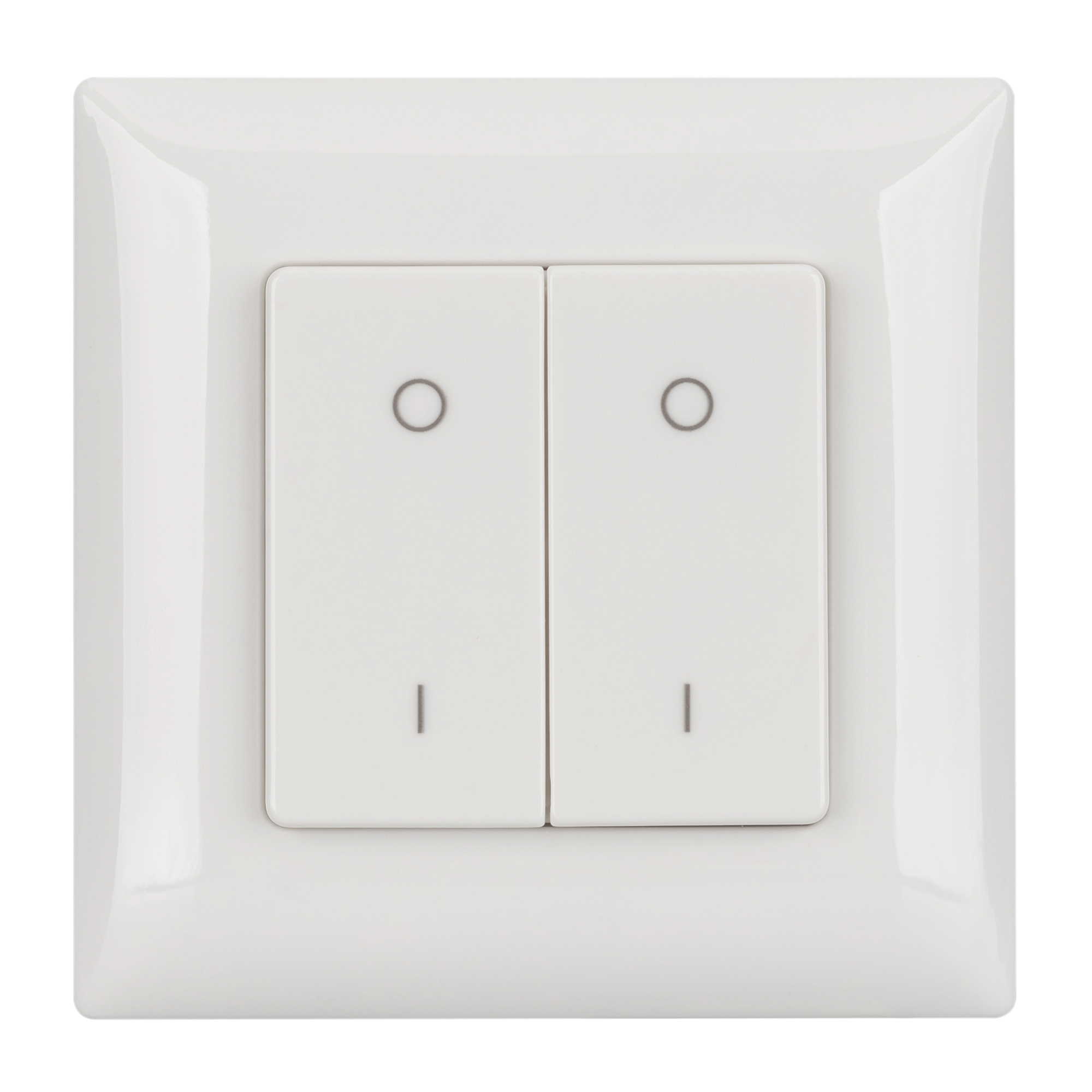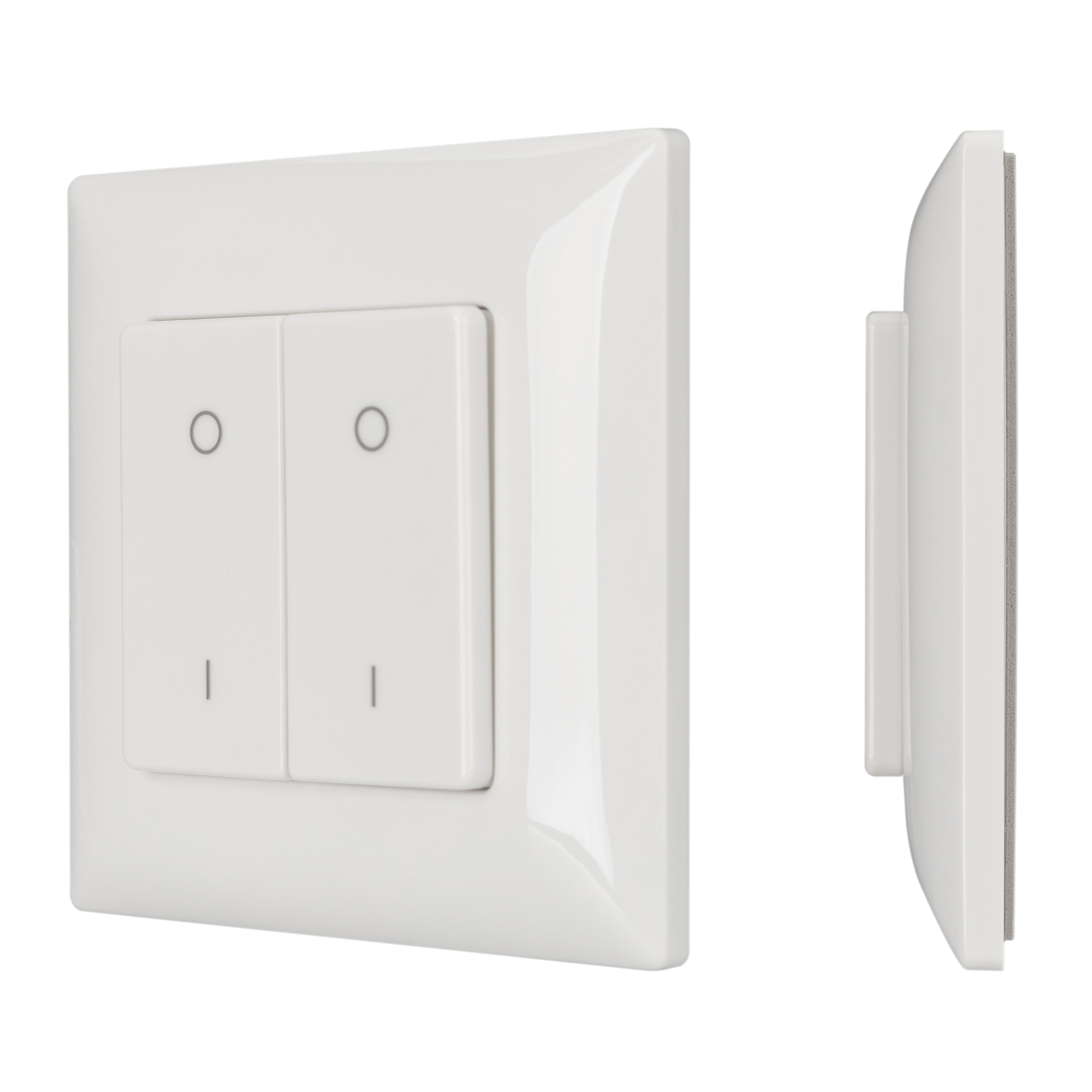 Накладная кнопочная панель 2.4 ГГц, цвет белый. Материал - пластик. Для управления одноцветными источниками света (ШИМ), 2 зоны управления. Питание/рабочее напряжение 3VDC от батарейки CR2025. Габариты 86х86х14 мм. Панель совместима с диммерами серии SMART.